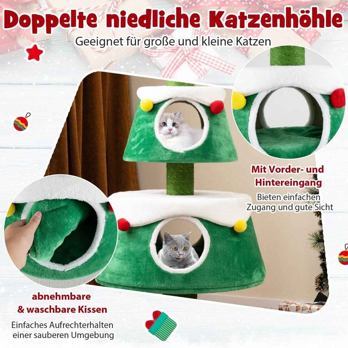Kalėdinės eglutės formos draskyklė katėms su dviem nameliais ir tvirtais stulpais (Žalia)
