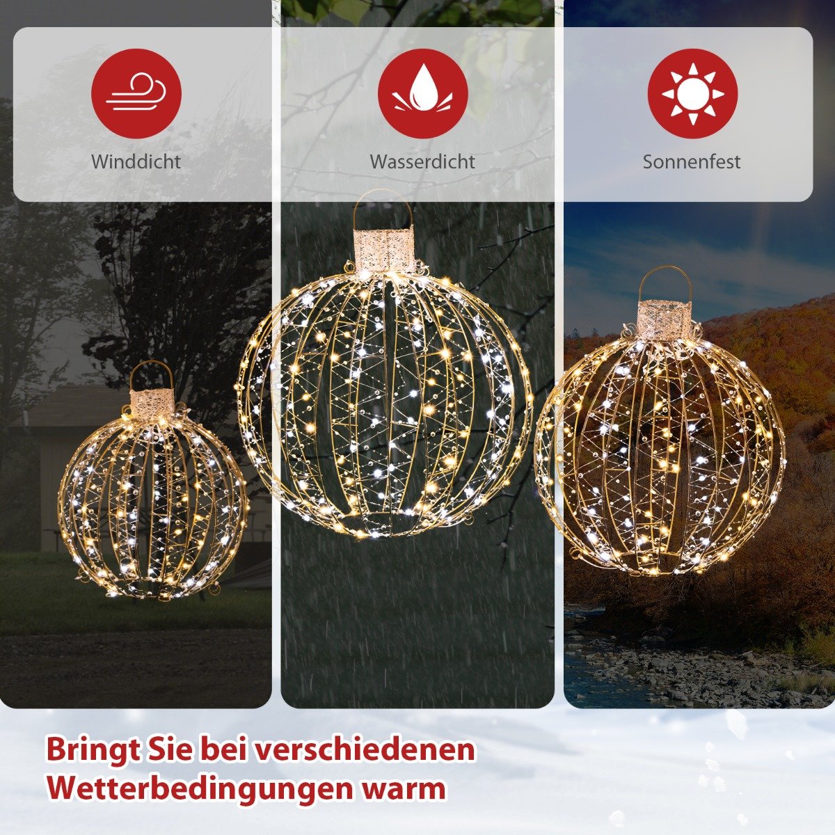 Sukurkite magišką švenčių atmosferą su šiais nuostabiais LED šviesos kamuoliais. Šis trijų skirtingų dydžių kamuolių rinkinys suteikia jums laisvės derinti ir kurti unikalias dekoracijas jūsų namuose ar sode.