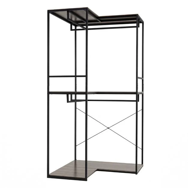 Šis kampinis drabužių stovas padės palaikyti tvarką Jūsų namuose ir taps puikiu sprendimu! L formos stove yra 3 atviros lentynos, kurių sumanus dizainas leidžia patogiai laikyti patalynę, drabužius ir batus. Be to, jame yra 2 drabužių pakabos, ant kurių galite kabinti lengvai glamžomus drabužius. Dėl 90° kampinio dizaino, šis stovas puikiai prisitaiko prie siaurų erdvių ir puikiai tinka tiek svetainei, tiek miegamajam ar prieškambariui.