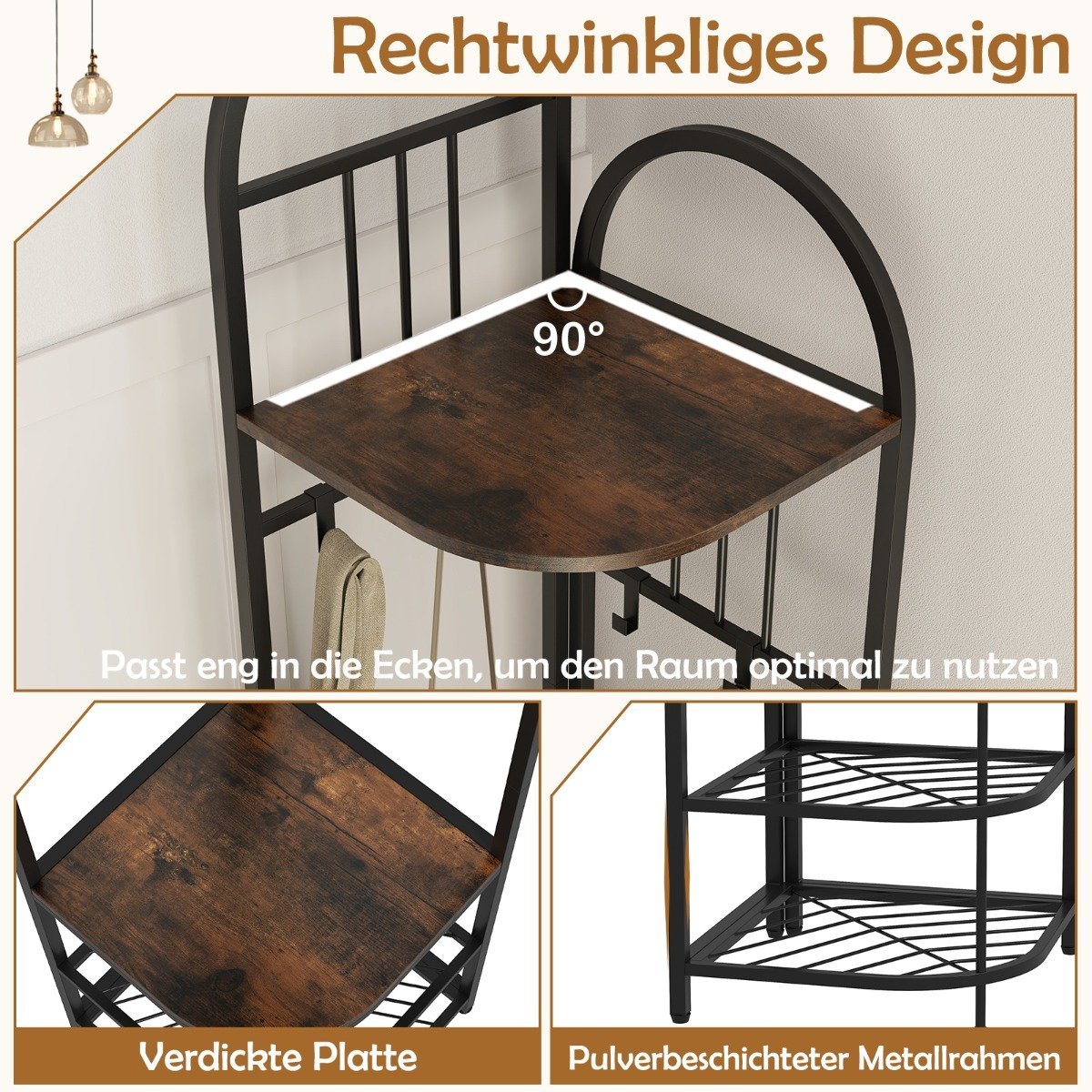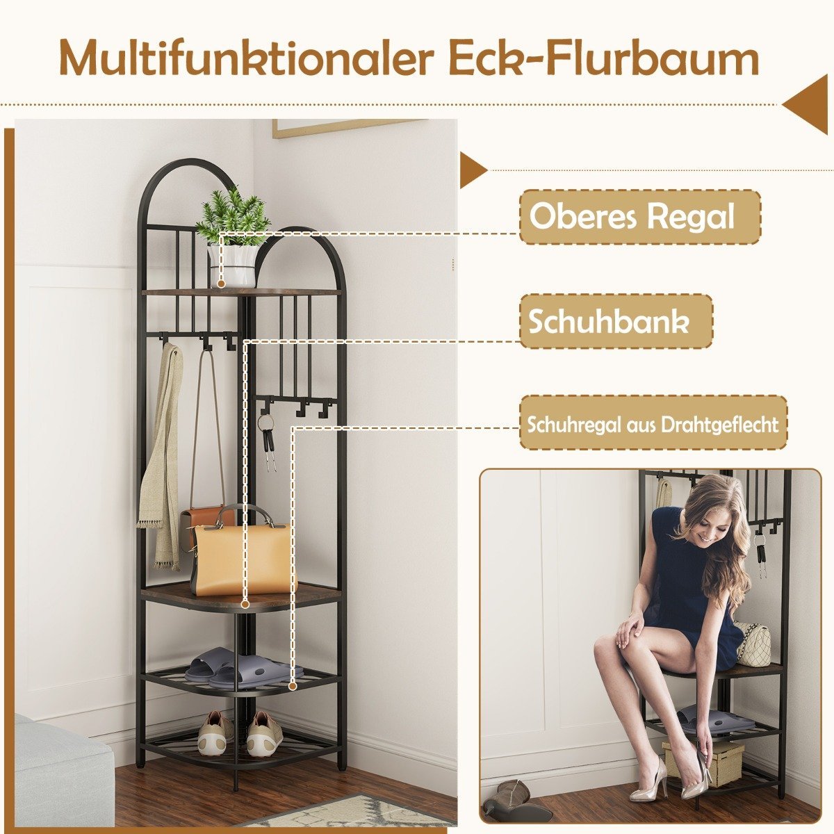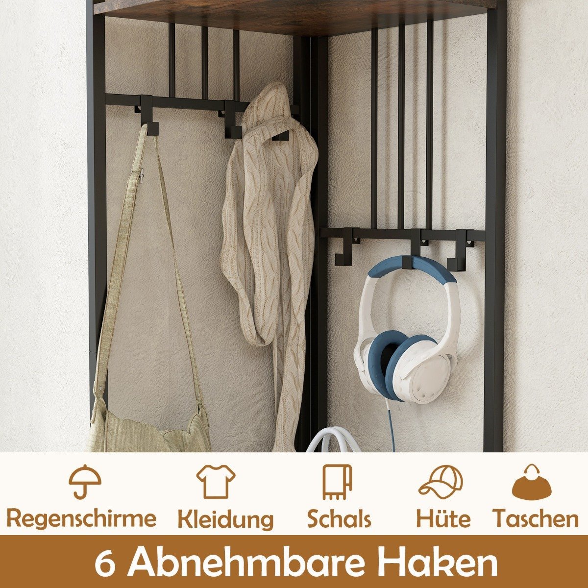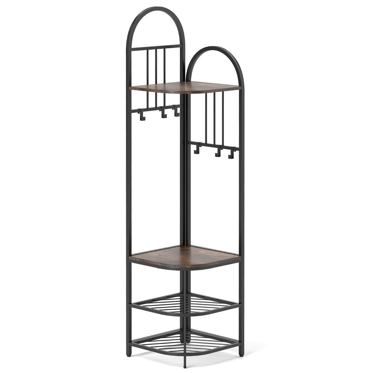 Kampinė drabužių kabyklos stova su batų lentyna ir 6 kabliais (Rudas)