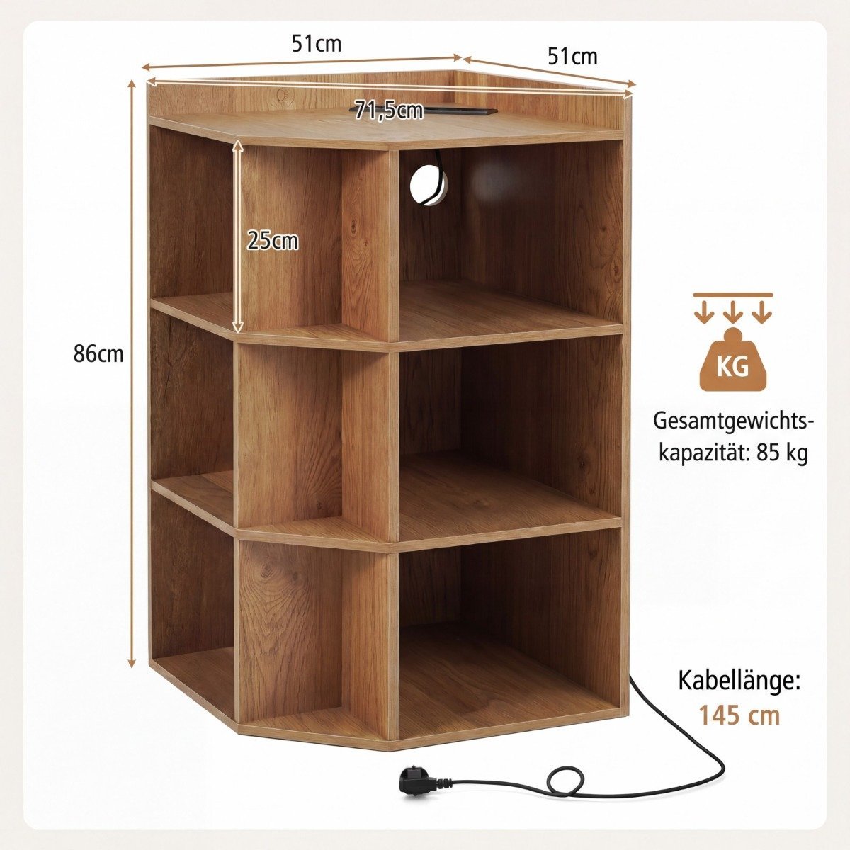 Mūsų kampinė knygų lentyna ne tik padės tvarkingai sutvarkyti daiktus, bet ir leis patogiai įkrauti telefonus bei nešiojamuosius kompiuterius. Su 4 kintamosios srovės lizdais ir 2 USB prievadais, ši lentyna yra puikus sprendimas palaikyti tvarką ir užtikrinti, kad jūsų įrenginiai visada būtų parengti naudoti. Ji idealiai tinka svetainei, miegamajam ar biurui, maksimaliai išnaudojant ribotą erdvę.