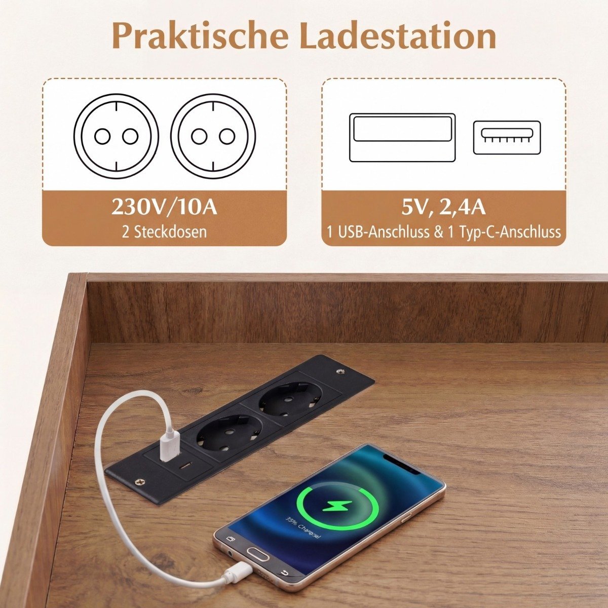 - Integruota įkrovimo stotelė su 4 kintamosios srovės lizdais ir 2 USB prievadais, skirta patogiam įrenginių įkrovimui.