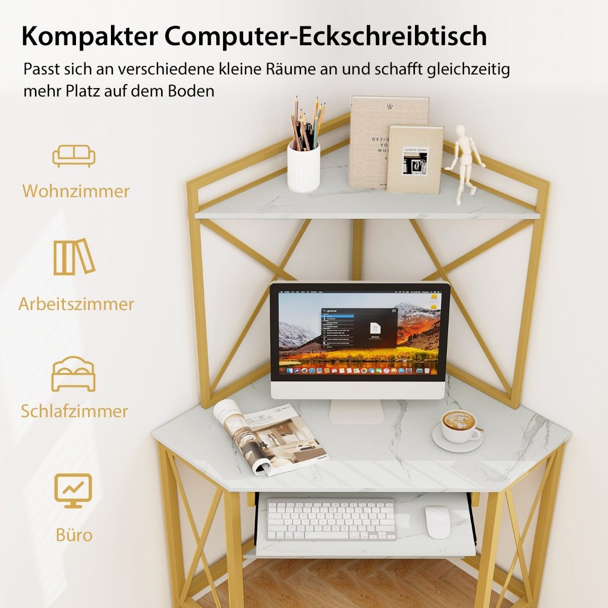 Šis kampinis rašomasis stalas, sujungiantis spintelę ir darbo stalą, suteikia daugiau vietos daiktams laikyti nei įprasti rašomieji stalai. Erdvus darbo paviršius su ištraukiama klaviatūros dėkle ir papildoma apatine lentyna užtikrina patogią darbo vietą. Integruota pakrovimo stotelė su dviem kintamosios srovės lizdais ir dviem USB prievadais leis visada palaikyti jūsų įrenginius įkrautais.