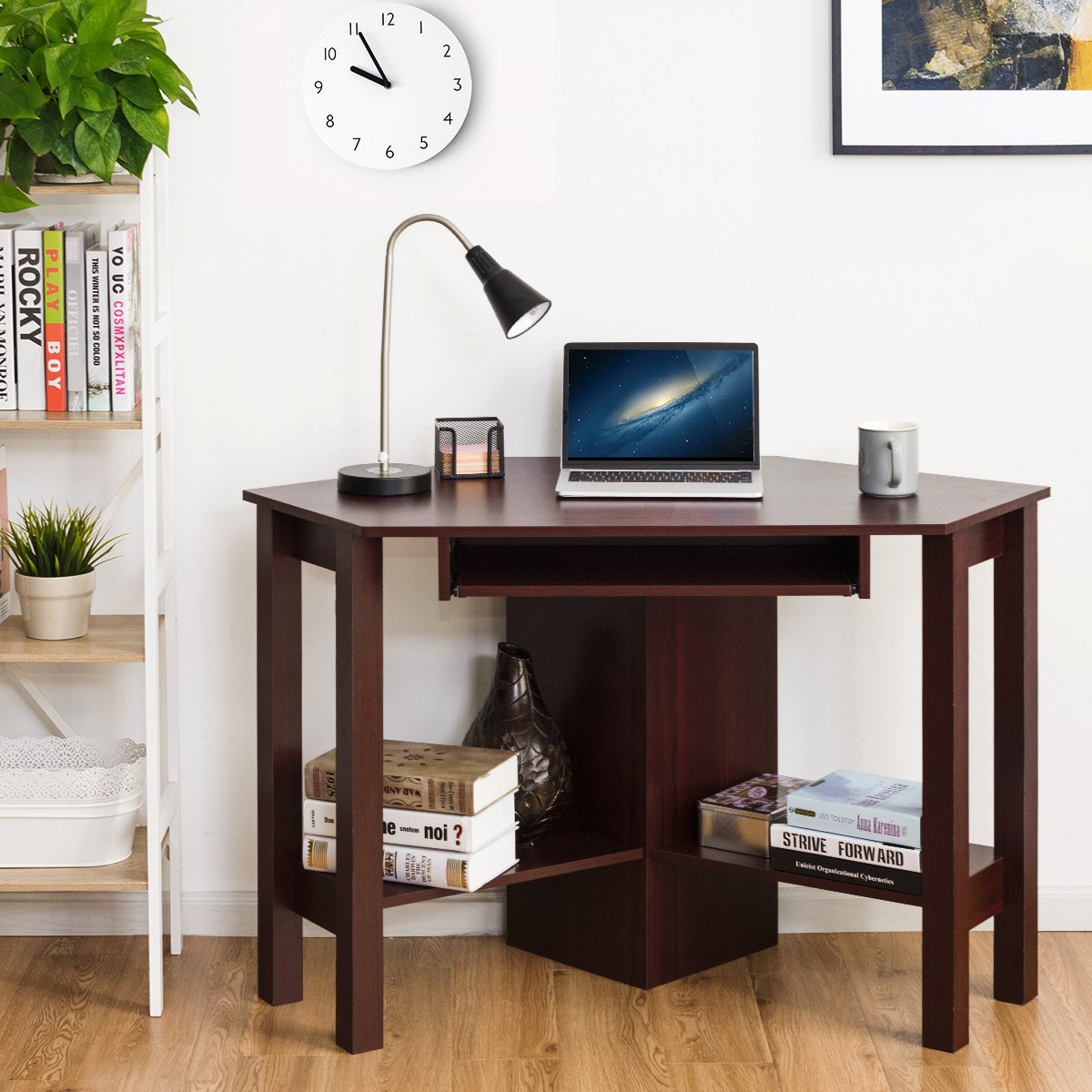 Kampinis rašomasis stalas su stalčiumi ir lentynomis (Ruda)