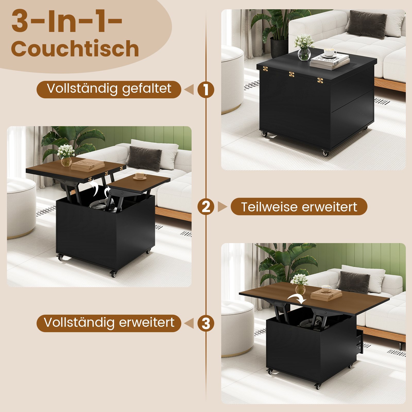 Kavos staliukas su pakeliama viršutine plokšte ir 3-in-1 išskleidimo funkcija (Juoda)