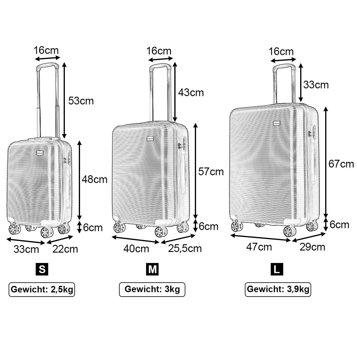 Mūsų itin lengvas lagaminų komplektas pasižymi puikiu dizainu ir taps jūsų tobulu kelionių palydovu. Aukščiausios kokybės pagaminimas ir įvairios daiktų pakavimo galimybės, įskaitant diržus, skyrius bei papildomą tinklinę kišenę, patenkins visus jūsų poreikius. Tvirtas ABS plastiko korpusas atrodo itin stilingai ir yra ypač atsparus smūgiams bei įbrėžimams, atsirandantiems ant bagažo juostos ar registruojant bagažą. Didelės talpos lagaminų komplektas tinka visų tipų kelionėms – atostogoms, trumpoms išvykoms, verslo ar pasaulinėms kelionėms.