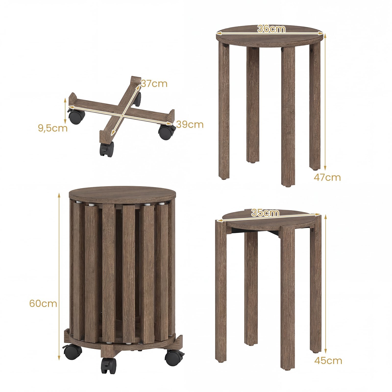 Šis 4-in-1 sustatomų taburečių komplektas derina funkcionalumą ir lankstumą, siūlydamas modernų sprendimą jūsų namams. Rinkinį sudaro dvi didelės ir dvi mažos taburetės bei mobilusis pagrindas su ratukais, leidžiantis taupyti vietą ir lanksčiai pritaikyti komplektą pagal poreikį. Puikiai pravers kaip papildoma sėdėjimo vieta, šoninis staliukas ar net mobilus augalų stovas.