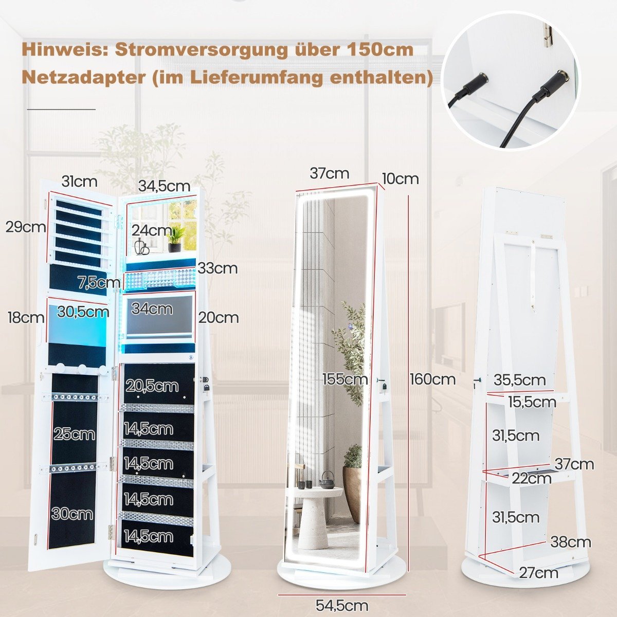 Kojinė papuošalų spintelė su veidrodžiu ir LED apšvietimu (Balta)
