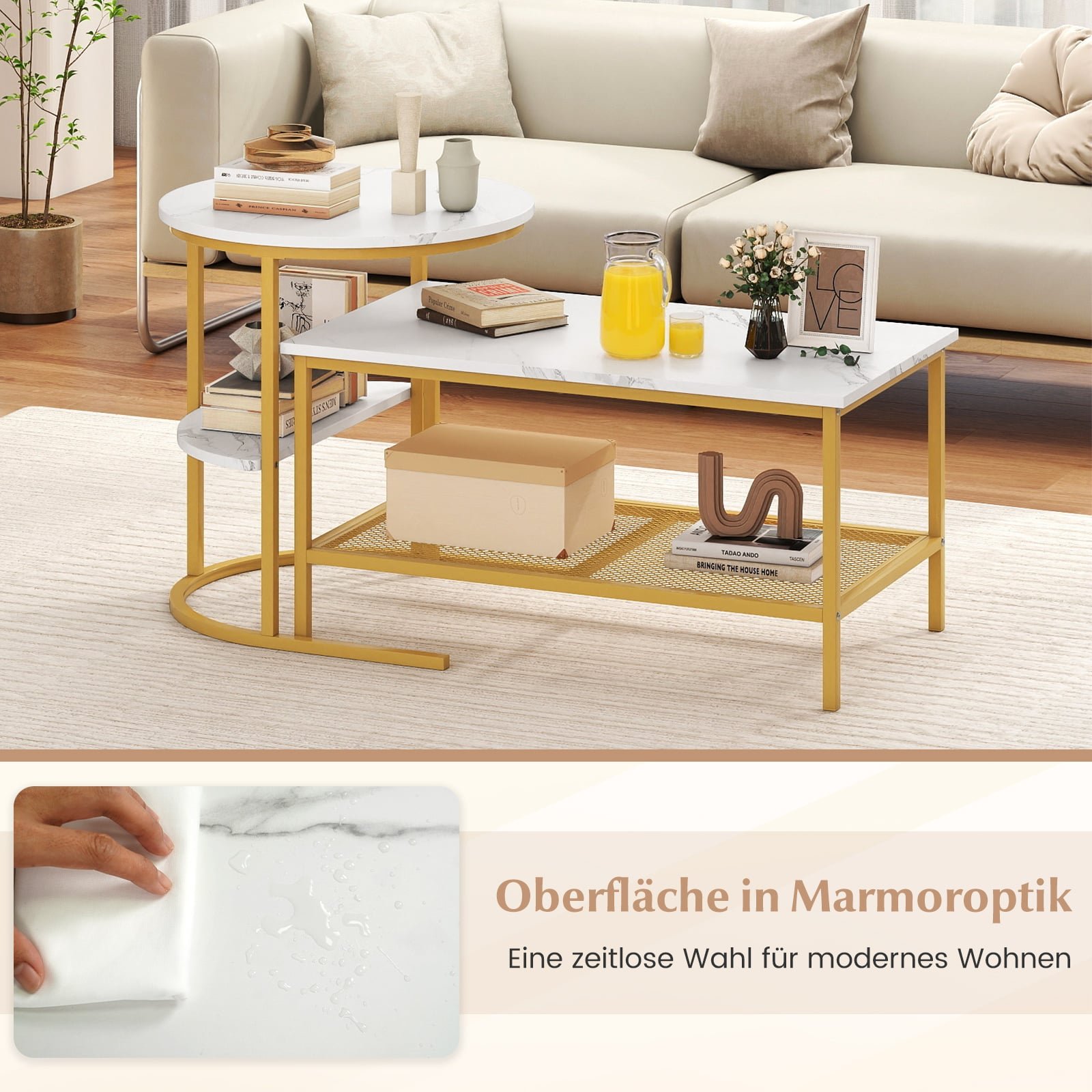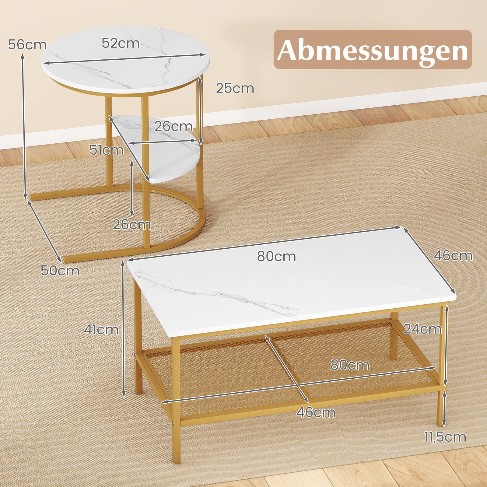 Mūsų 2 dalių kavos staliukų komplektas, kurį sudaro didelis kavos staliukas ir mažas apvalus šoninis staliukas, siūlo išskirtinį lankstumą ir funkcionalumą Jūsų namams. Šiuos staliukus galima naudoti kartu arba atskirai, todėl lengvai sukursite įvairius baldų išdėstymus, tobulai tinkančius bet kuriai erdvei. Elegantiškas dirbtinio marmuro stalviršis Jūsų interjerui suteiks subtilios prabangos ir rafinuoto stiliaus.