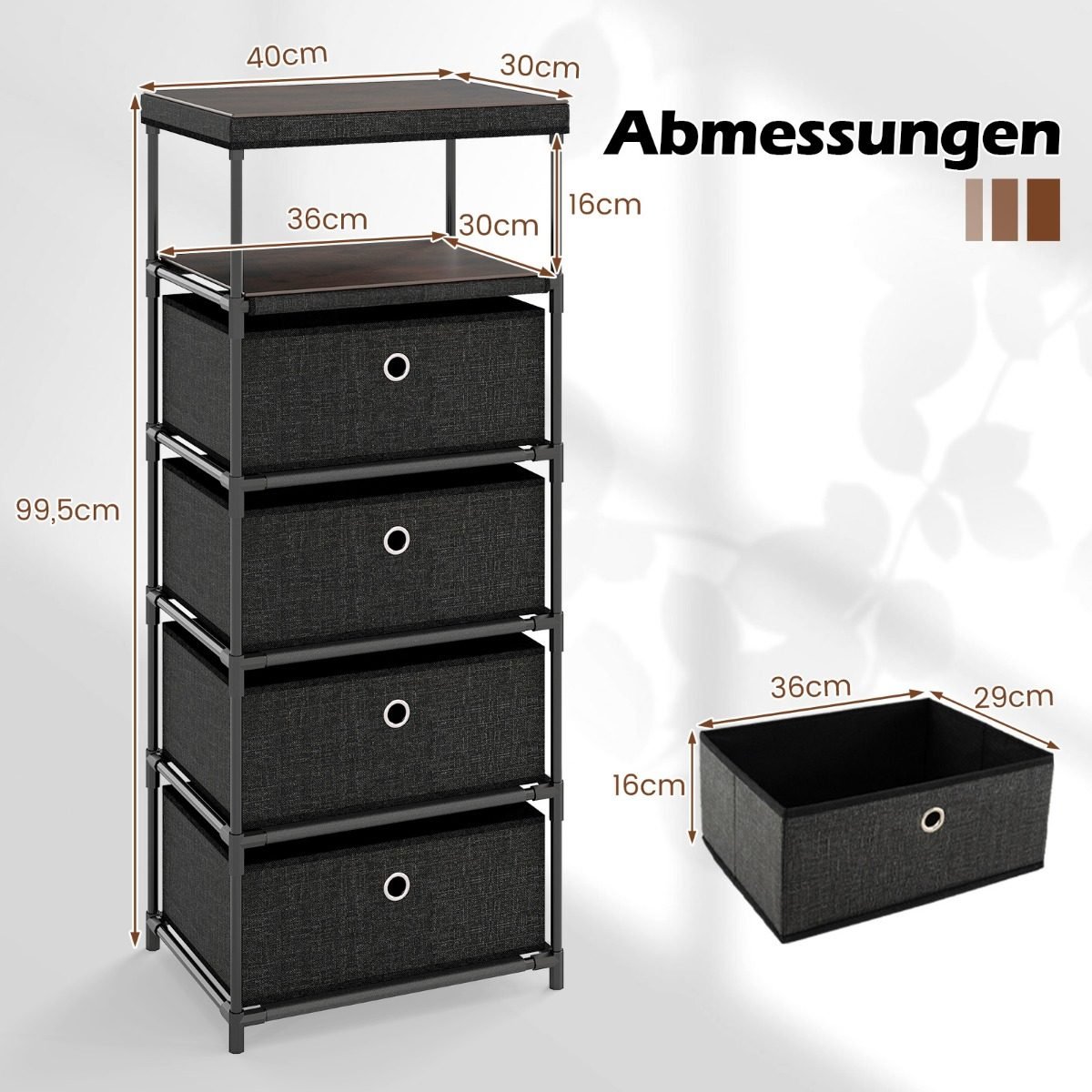 - Daug vietos daiktams laikyti: 4 išimami ir sulankstomi medžiaginiai stalčiai.