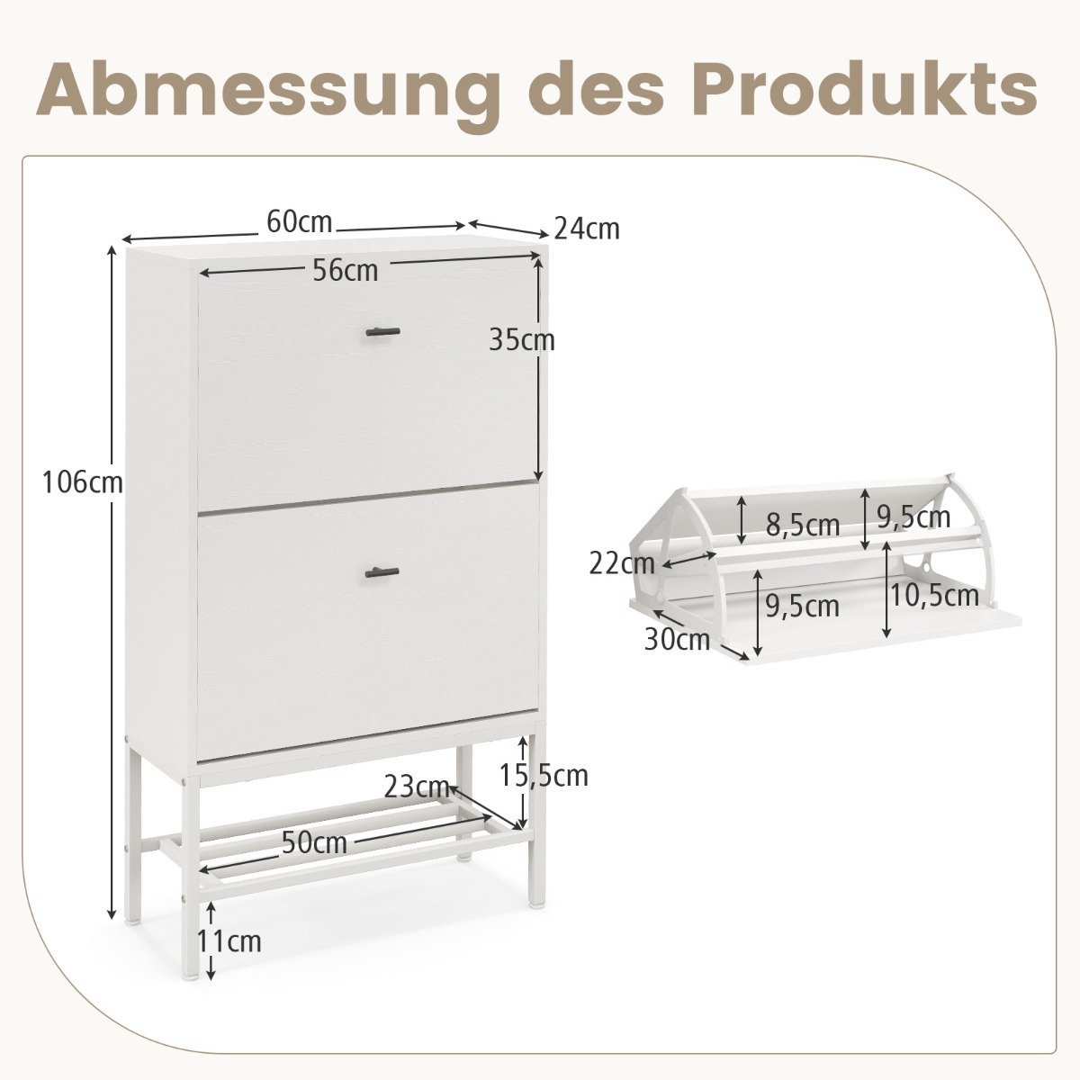 - Lankstus sandėliavimas: 2 atlenkiamos durelės su reguliuojamomis ir išimamomis lentynomis leidžia laikyti įvairius batų tipus.