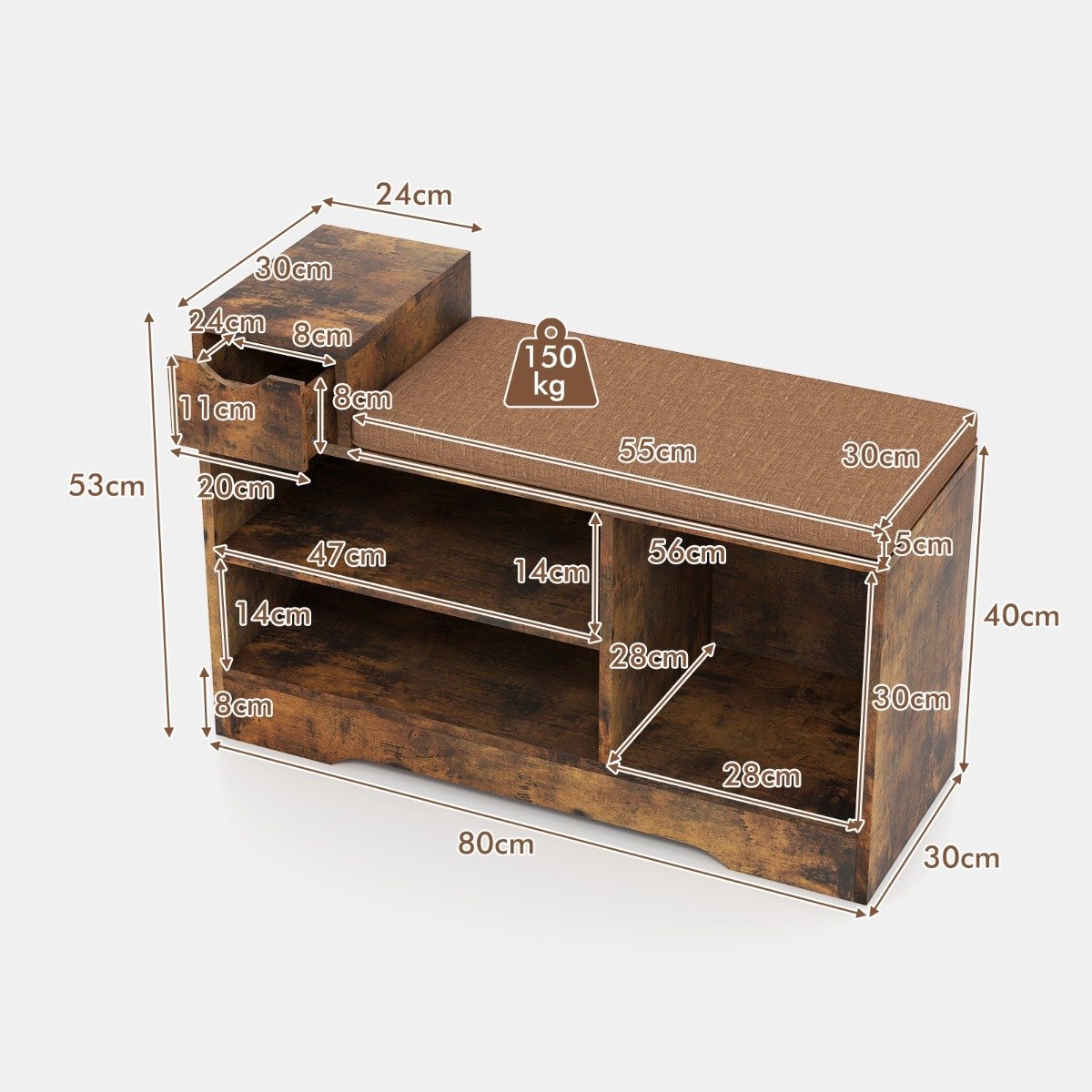 Kompaktiška batų spintelė su sėdyne ir stalčiumi (Rūdys)