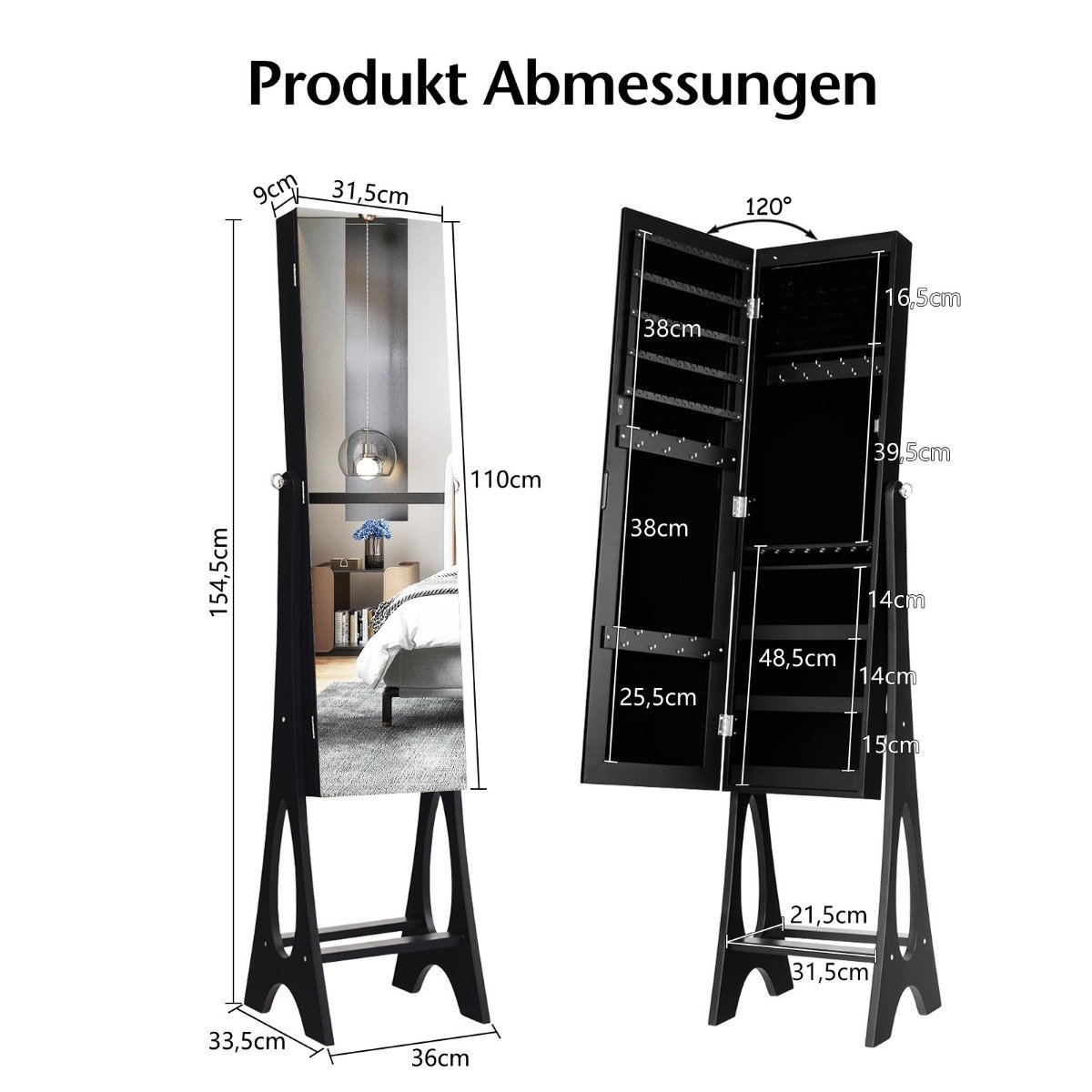 - Papuošalų spintos matmenys: 31,5 cm x 9 cm x 110 cm (Ilgis x Plotis x Aukštis)
