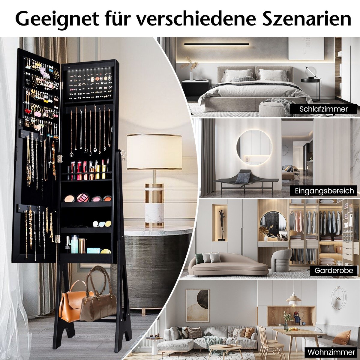 Atraskite puikų sprendimą savo papuošalams ir aksesuarams tvarkyti su šia elegantiška papuošalų spintele. Jos vientisas veidrodis ir integruotas apšvietimas leis jums lengvai pasipuošti ir atrasti norimus daiktus.