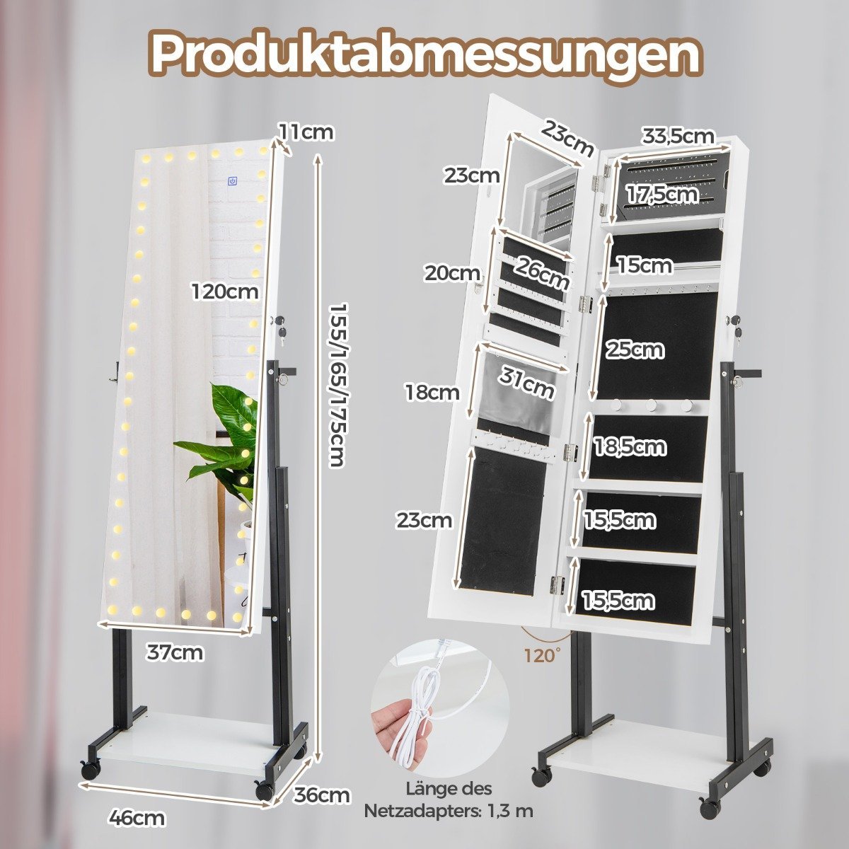 Stilinga ir funkcionali papuošalų spintelė su integruotu, visu kūną atspindinčiu veidrodžiu ir LED apšvietimu. Ši spintelė – puikus sprendimas tvarkingai laikyti ir lengvai rasti visus Jūsų papuošalus bei aksesuarus.