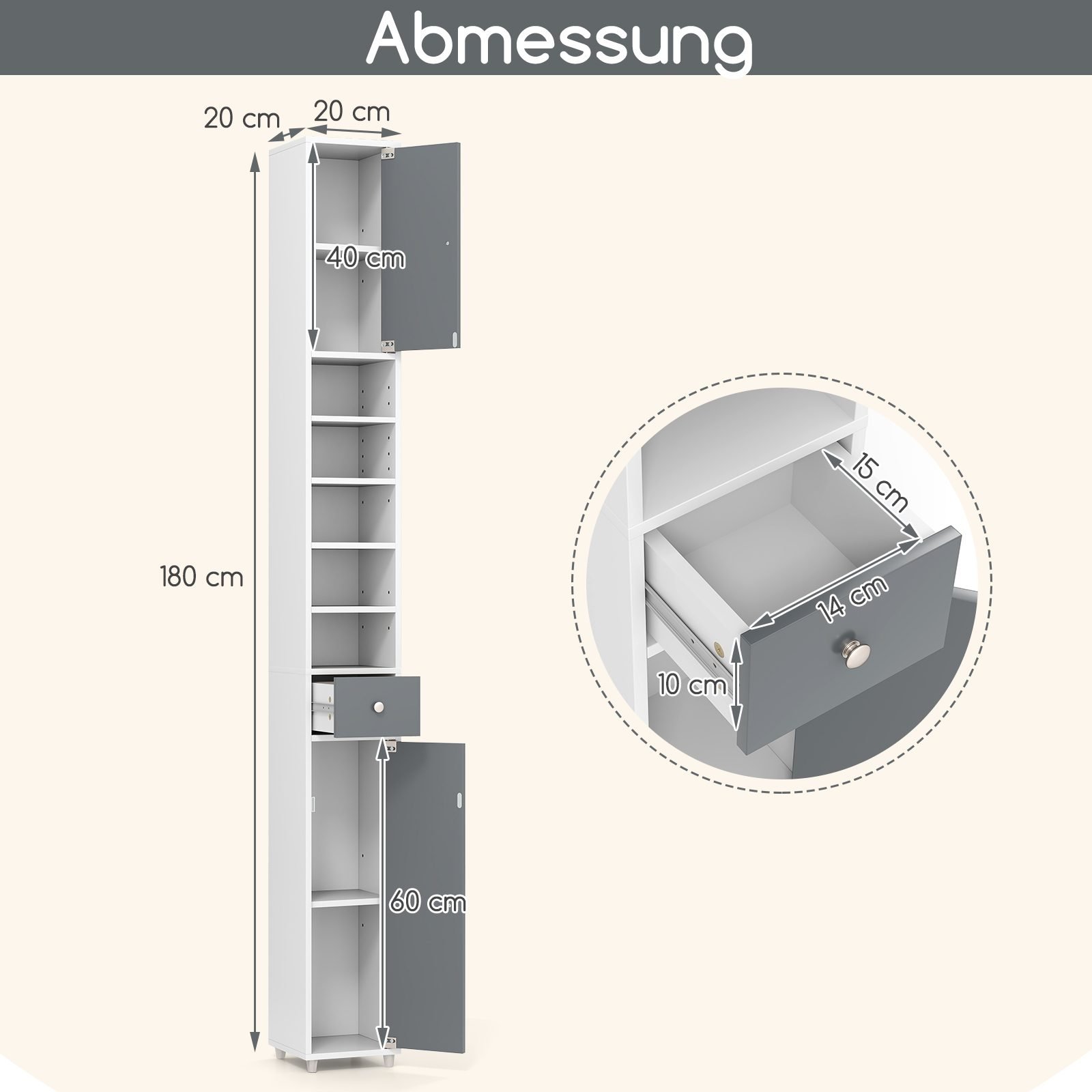 Kompaktiška vonios spintelė 20x20x180 cm (Pilka ir balta)