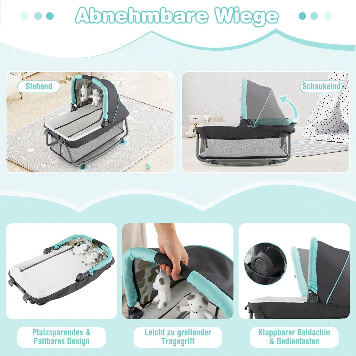 Pristatome universalų 4-in-1 sprendimą jūsų mažyliui: šis kompaktiškas vaikų darželio komplektas atlieka lopšio, vystymo stalo, kūdikio lovelės ir žaidimų aikštelės funkcijas. Sukurtas su saugia ir tvirta konstrukcija bei pagamintas iš aukščiausios kokybės, nekenksmingų medžiagų, jis užtikrina jūsų vaiko komfortą ir saugumą. Mylimiausių žaislų ir raminančios muzikos draugija miego ir žaidimų laikas taps dar malonesnis.