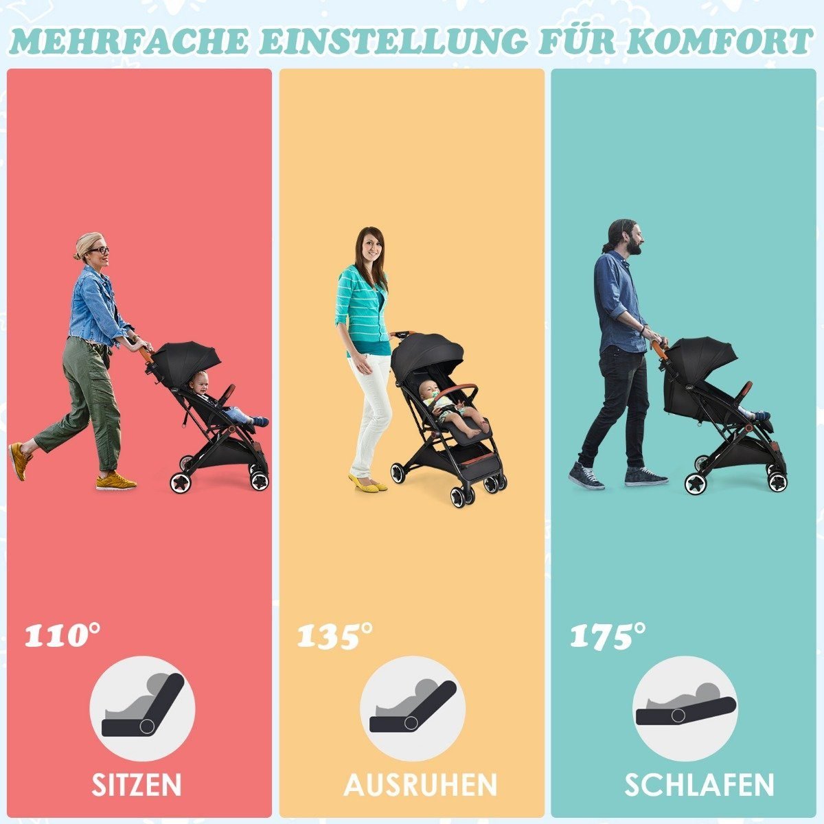 Kompaktiškas kelioninis vežimėlis su reguliuojamu atlošu (Juoda)