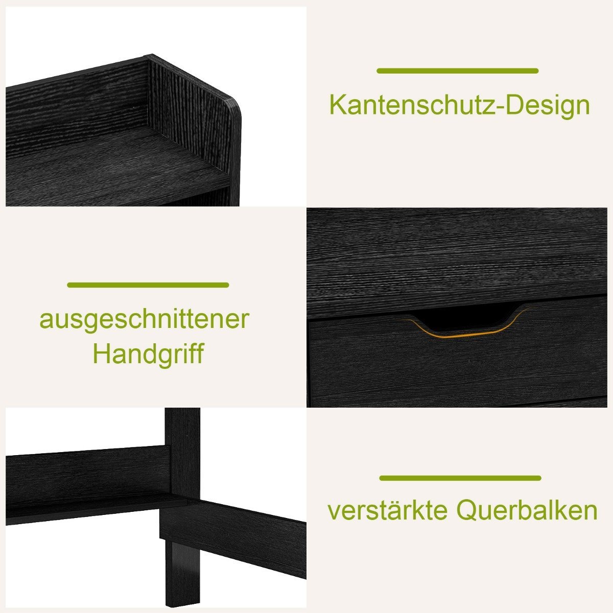 - Tvirtas ir stabilus dizainas su sustiprintomis skersinėmis atramomis ir apsauginiais grindų padeliais nuo subraižymų.