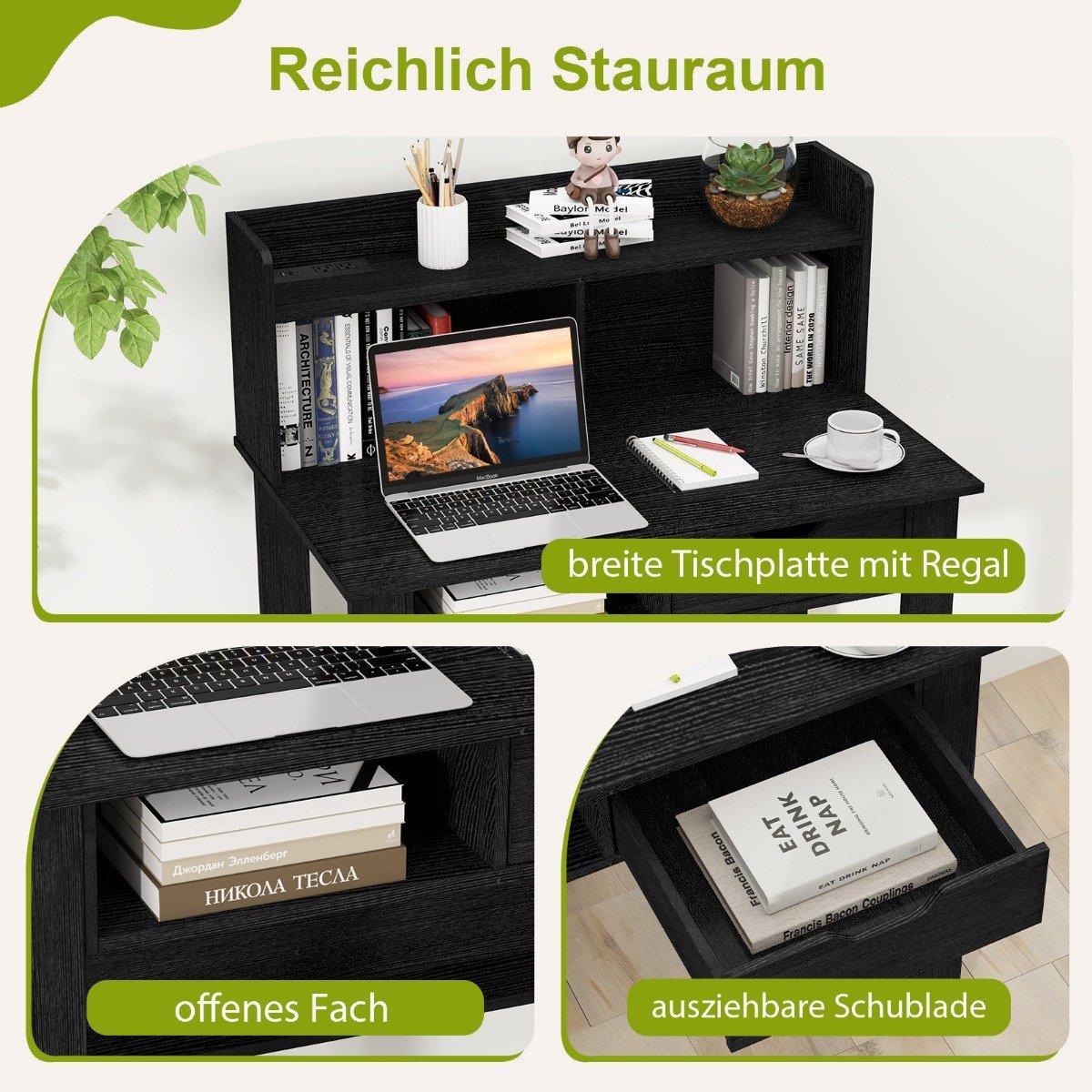 - Uždaromas stalčius ir atvira niša suteikia papildomos vietos smulkiems daiktams ir biuro reikmenims laikyti.