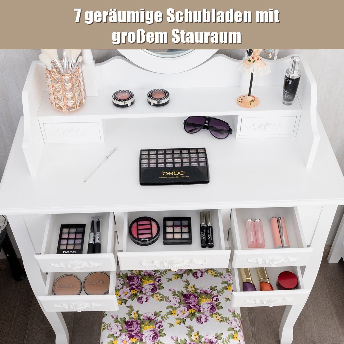 Kompaktiškas tualetinis staliukas su veidrodžiu ir pufu (Balta)
