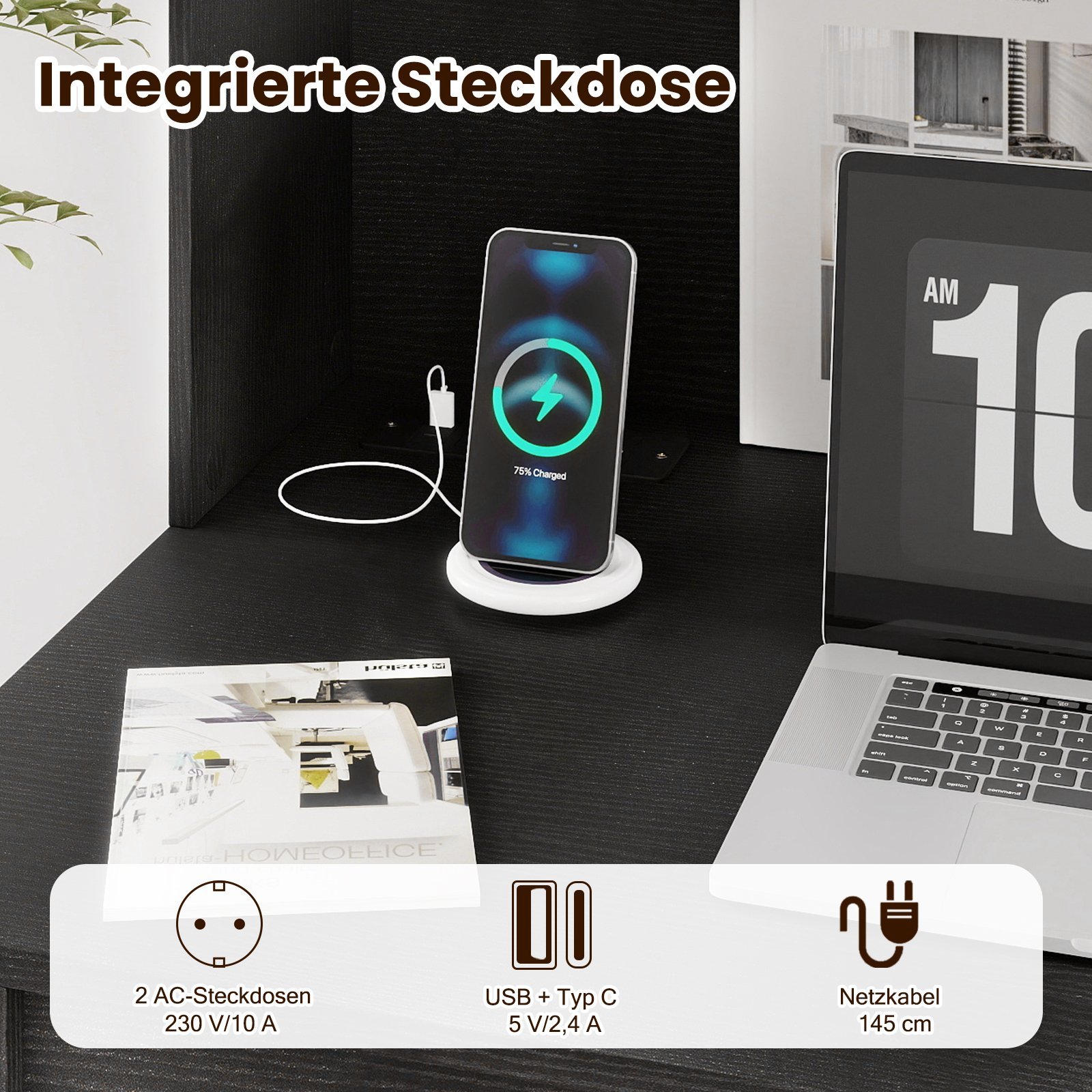 Pagerinkite savo darbo erdvę su šiuolaikišku kompiuterio stalu, kuriame modernus dizainas susilieja su funkcionalumu. Su integruotu elektros lizdų bloku, įskaitant USB ir C tipo jungtis, stalas užtikrina, kad jūsų įrenginiai visada būtų įkrauti ir po ranka. Apgalvotai suprojektuotas antstatas su lentynomis padeda palaikyti tvarką, o integruotas kabelių pravedimas efektyviai paslepia laidus, sukuriant estetišką ir organizuotą darbo aplinką. Tvirtos stalo kojos garantuoja stabilų ir patikimą stovėjimą be jokių svyravimų.