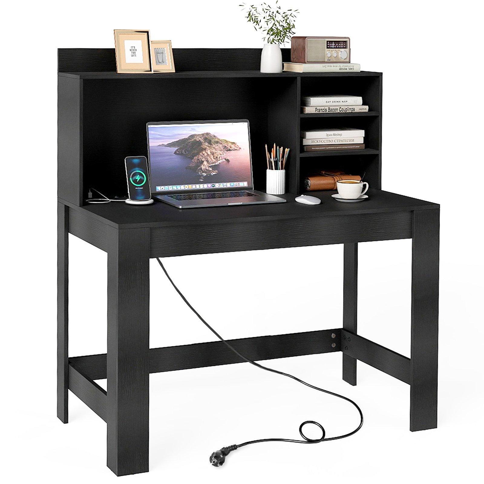 Kompiuterio stalas su antstatu ir integruotais elektros lizdais (Juoda)