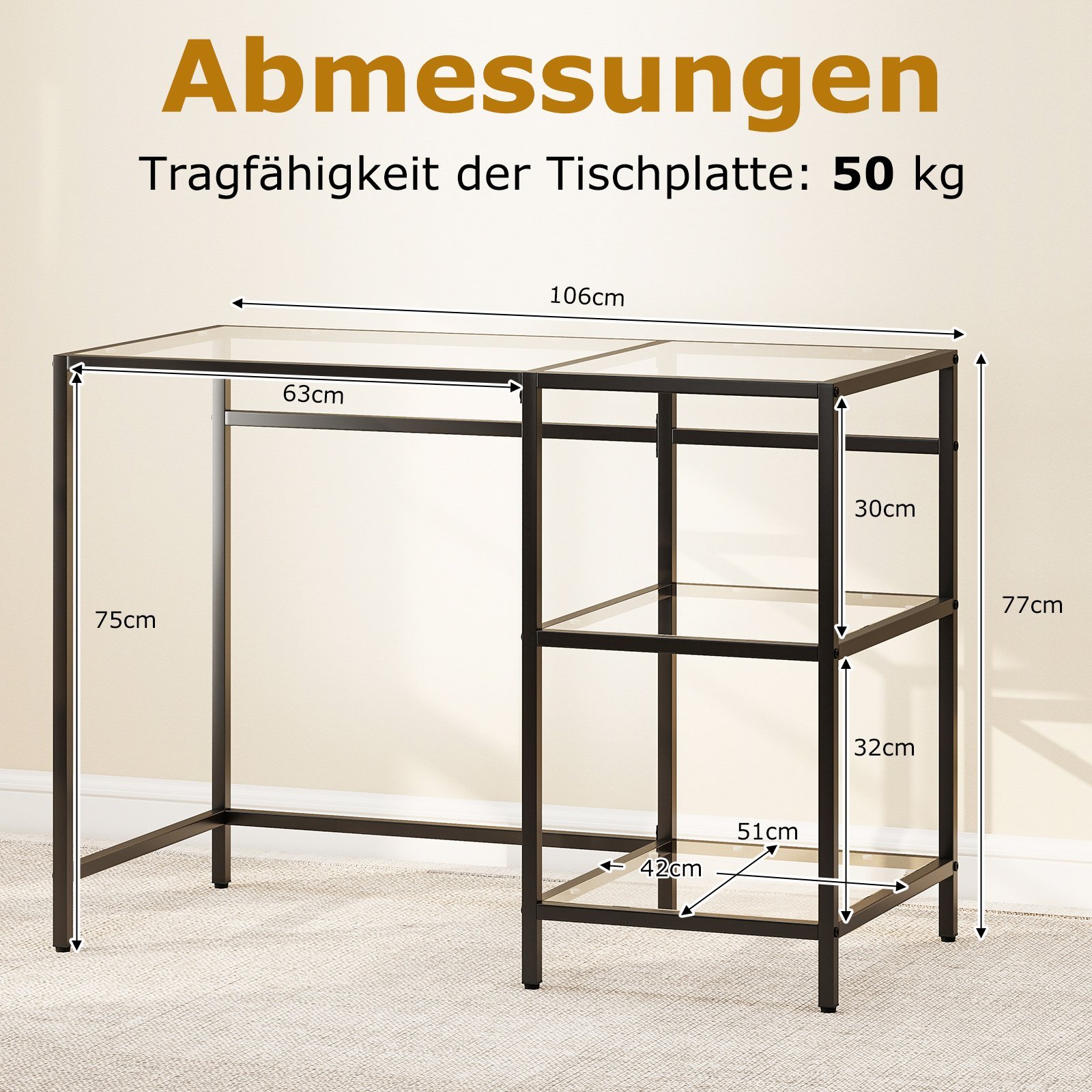 Šis erdvus stalas su dviem atviromis lentynomis ir tvirtu grūdinto stiklo stalviršiu suteikia daug vietos darbui ir patogiam daiktų laikymui. Jo tvirtas metalinis rėmas užtikrina stabilumą, o reguliuojami kojų padai apsaugo grindis ir užtikrina stalo stabilumą net ant nelygių paviršių. Elegantiškas ir modernus dizainas leidžia šiam stalui puikiai derėti įvairiose erdvėse, harmoningai sujungiant funkcionalumą ir estetiką.