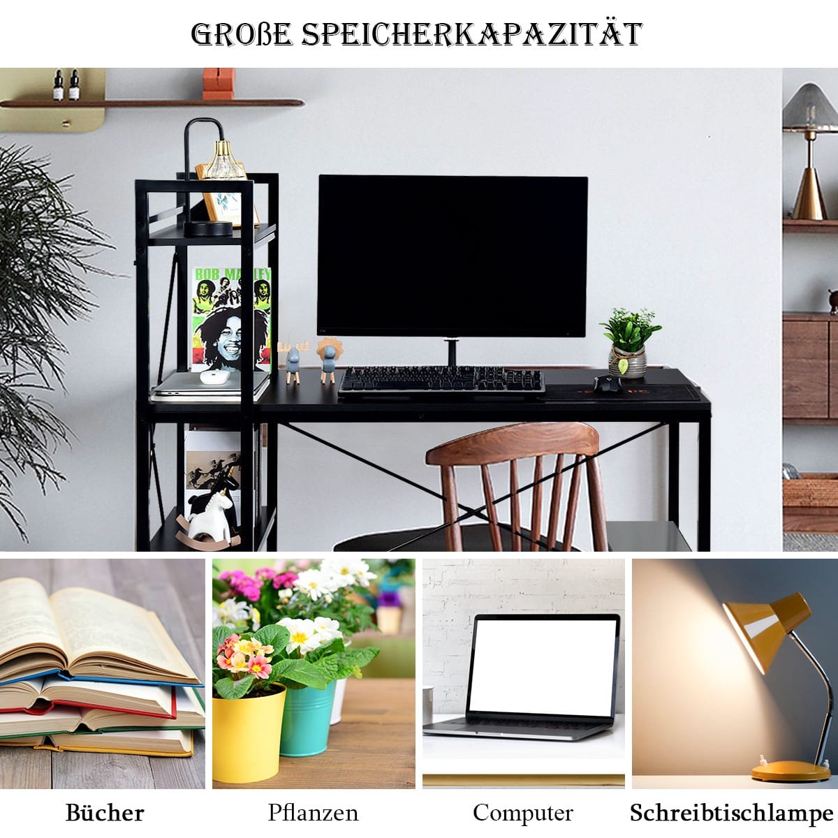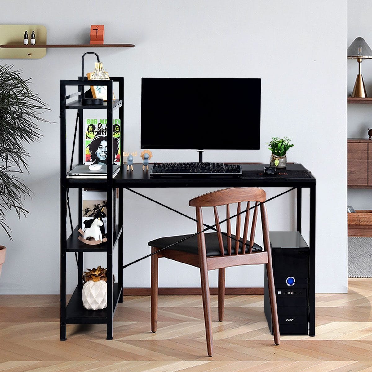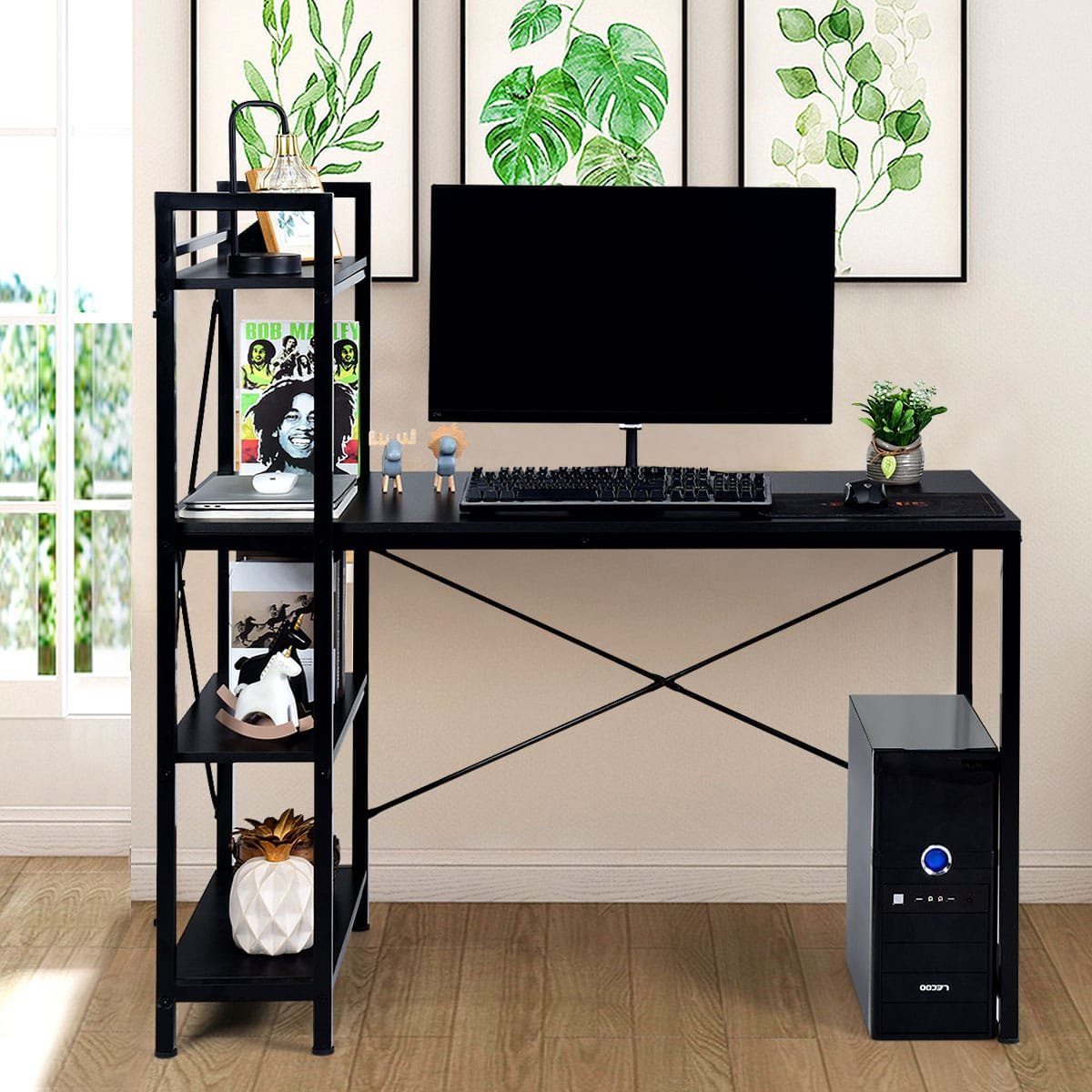 Kompiuterio stalas su keturių pakopų lentyna (Juoda)