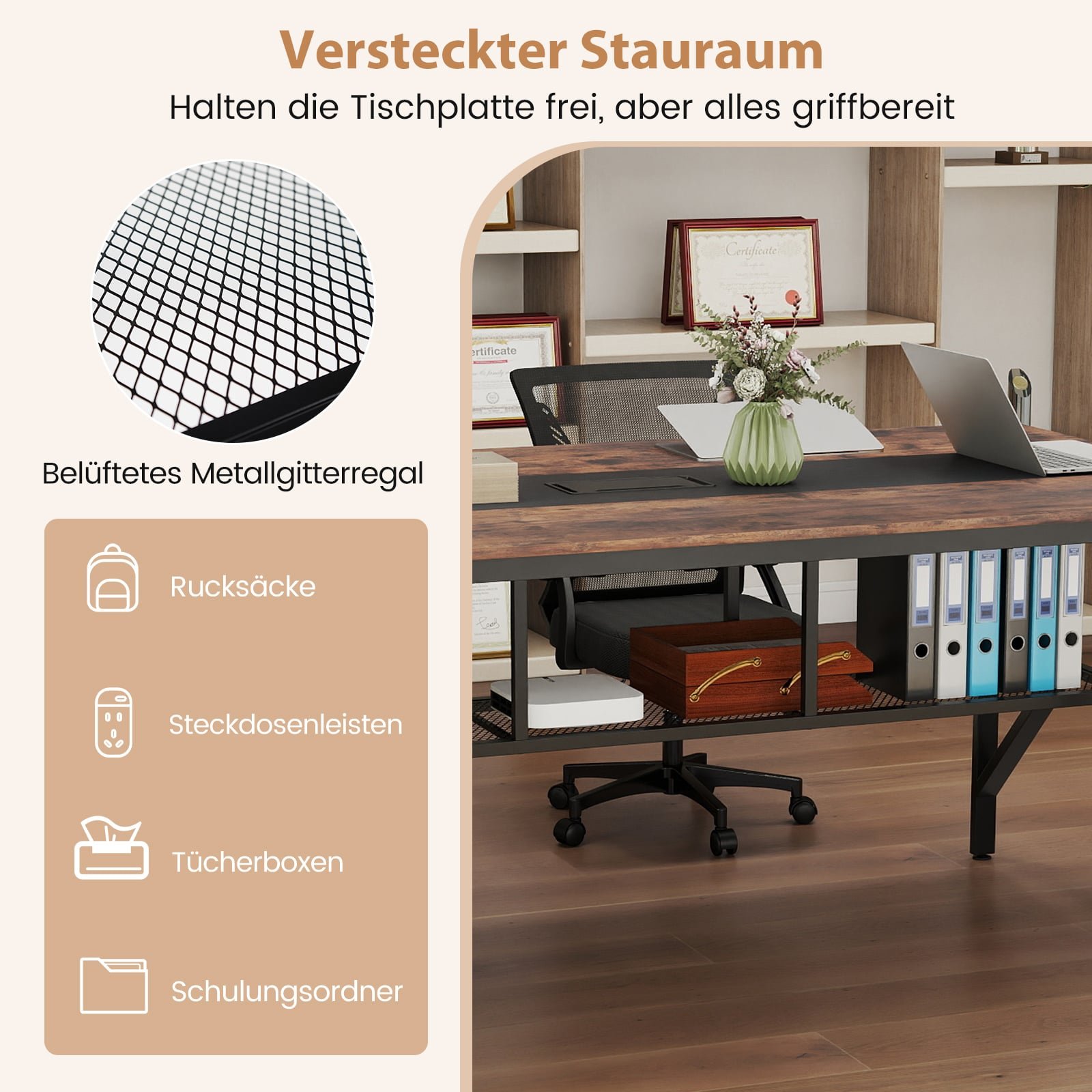 - Integruotas kabelių valdymas ir paslėpta tinklinė lentyna padeda palaikyti nepriekaištingą tvarką.