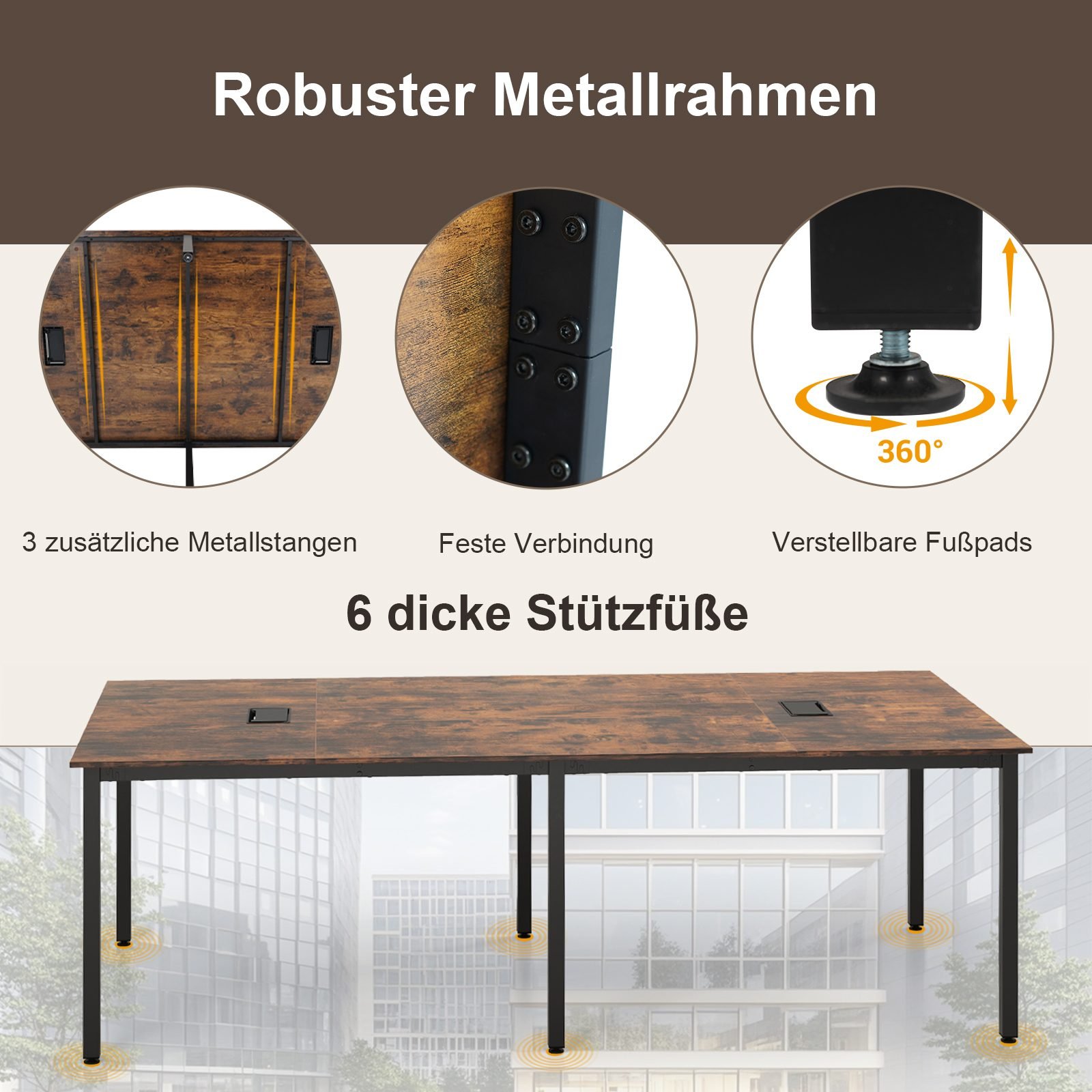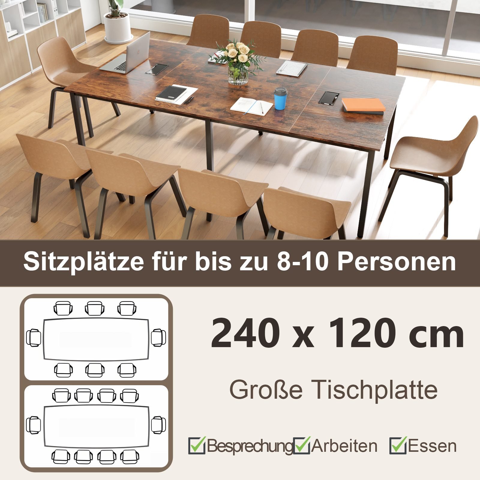 Modernizuokite savo biurą su šiuo 240 cm ilgio konferenciniu stalu – kur stilius dera su funkcionalumu! Šis tvirtas stalas, kuriame patogiai telpa iki 10 žmonių, puikiai tinka tiek dideliems susirinkimams, tiek dinamiškoms idėjų generavimo sesijoms. Pamirškite laidų raizginius ir mėgaukitės nepralenkiama ilgaamžiškumu dėl tvirto metalinio rėmo.