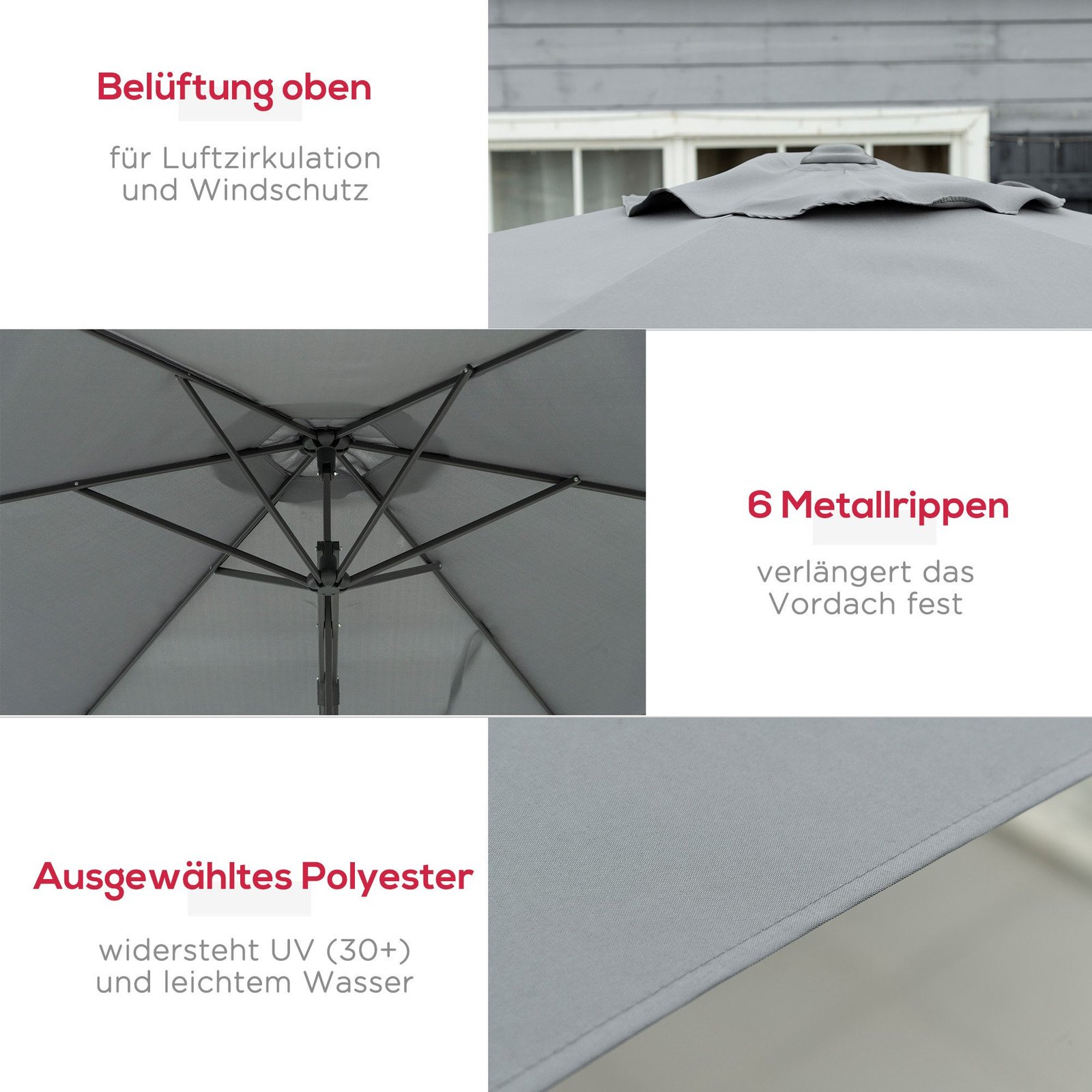 Šešėlis saulėtoms dienoms – šis didelis skėtis nuo saulės su stovu puikiai tinka sodui. Su stabiliu metaliniu stiebu tvirtam laikymui ir poliesterio danga, kuri suteikia pavėsį. Lengvas atidarymas ir uždarymas rankena, kad pakabinamas skėtis greitai būtų paruoštas naudoti. Kryžminis pagrindas įeina, svoriai neįeina į komplektą (reikalingas bent 60 kg svoris).
