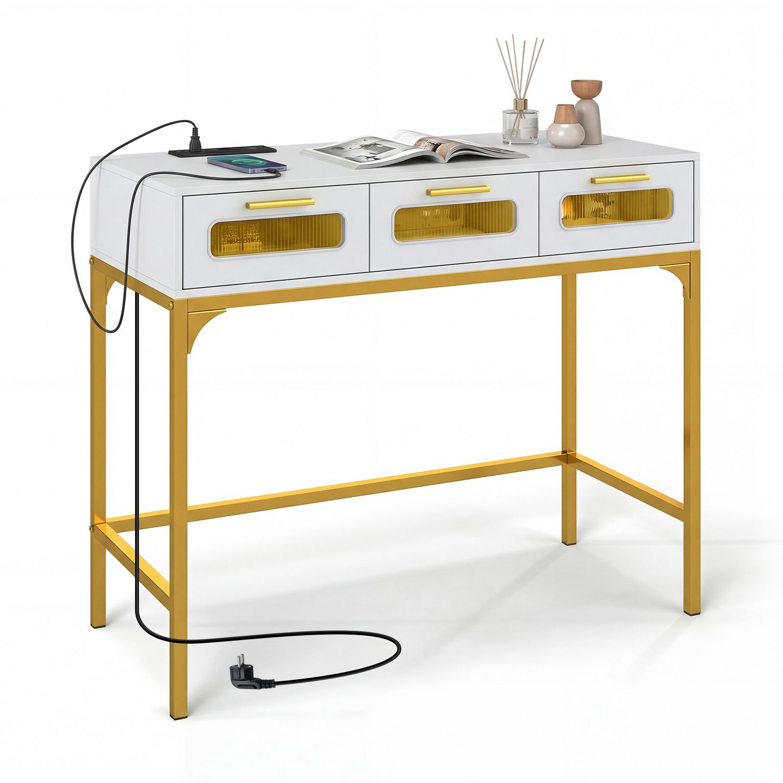 - Erdvus stalviršis ir 3 talpūs stalčiai, idealiai tinkantys raktams, kosmetikai ar biuro reikmenims.