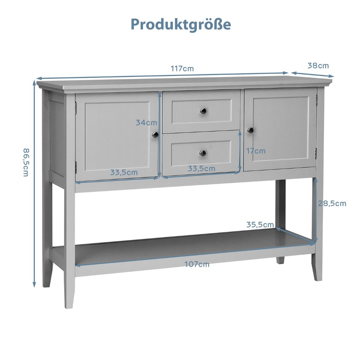 - Bendri matmenys: 117 x 38 x 86,5 cm (Ilgis x Plotis x Aukštis)