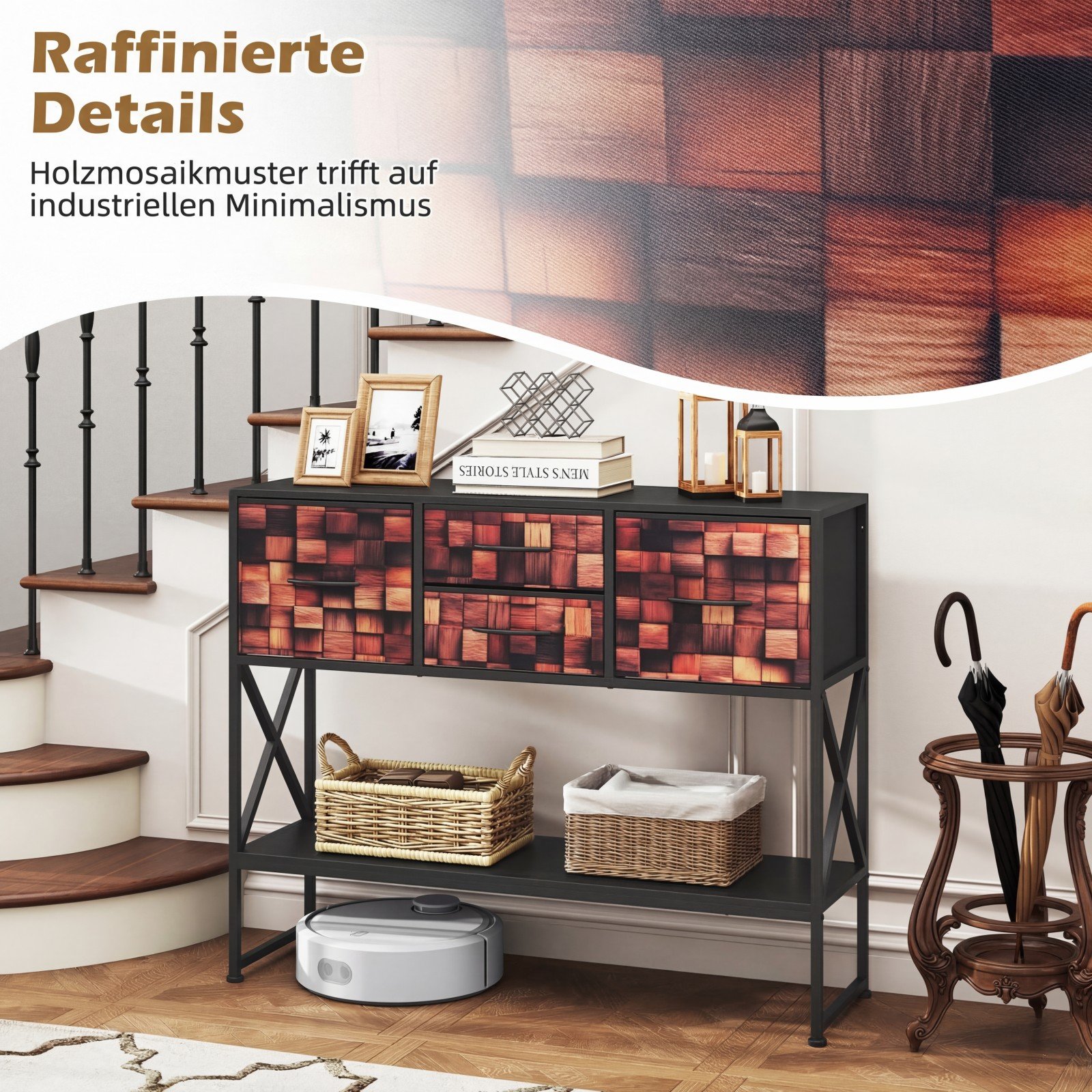 Įneškite tvarkos ir stiliaus į savo namus su šiuo elegantišku konsoliniu staliuku, kuris puikiai derina funkcionalumą ir modernų dizainą. Erdvus stalviršis, keturi medžiaginiai stalčiai ir atvira lentyna siūlo gausią erdvę daiktams laikyti. Unikalus medienos mozaikos raštas ne tik suteiks jūsų erdvei šiuolaikiškumo ir jaukumo, bet ir pavers įprastas patalpas stilingomis bei patraukliomis erdvėmis.