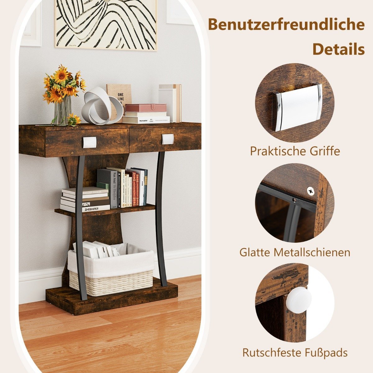 Atnaujinkite savo namus su šiuo stilingu ir funkcionaliu konsoliniu staliuku. Jis suteikia pakankamai vietos Jūsų daiktams laikyti ir puikiai papildys Jūsų interjerą.
