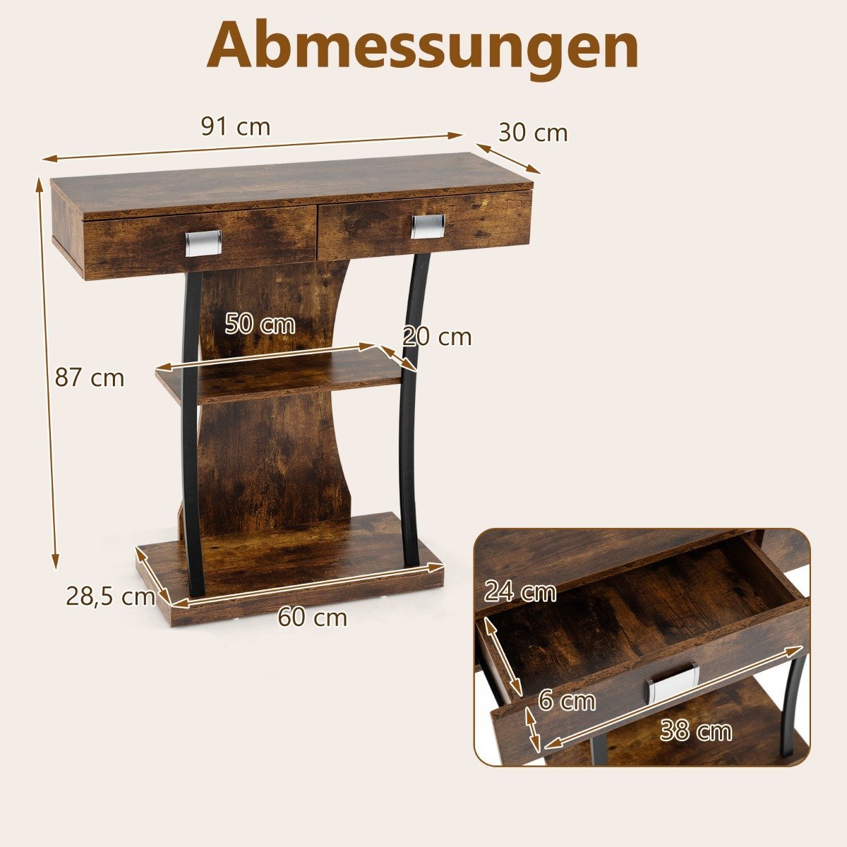 Konsolinis staliukas su dviem stalčiais ir dviem lentynomis 91x30x87 cm (Natūrali ruda)