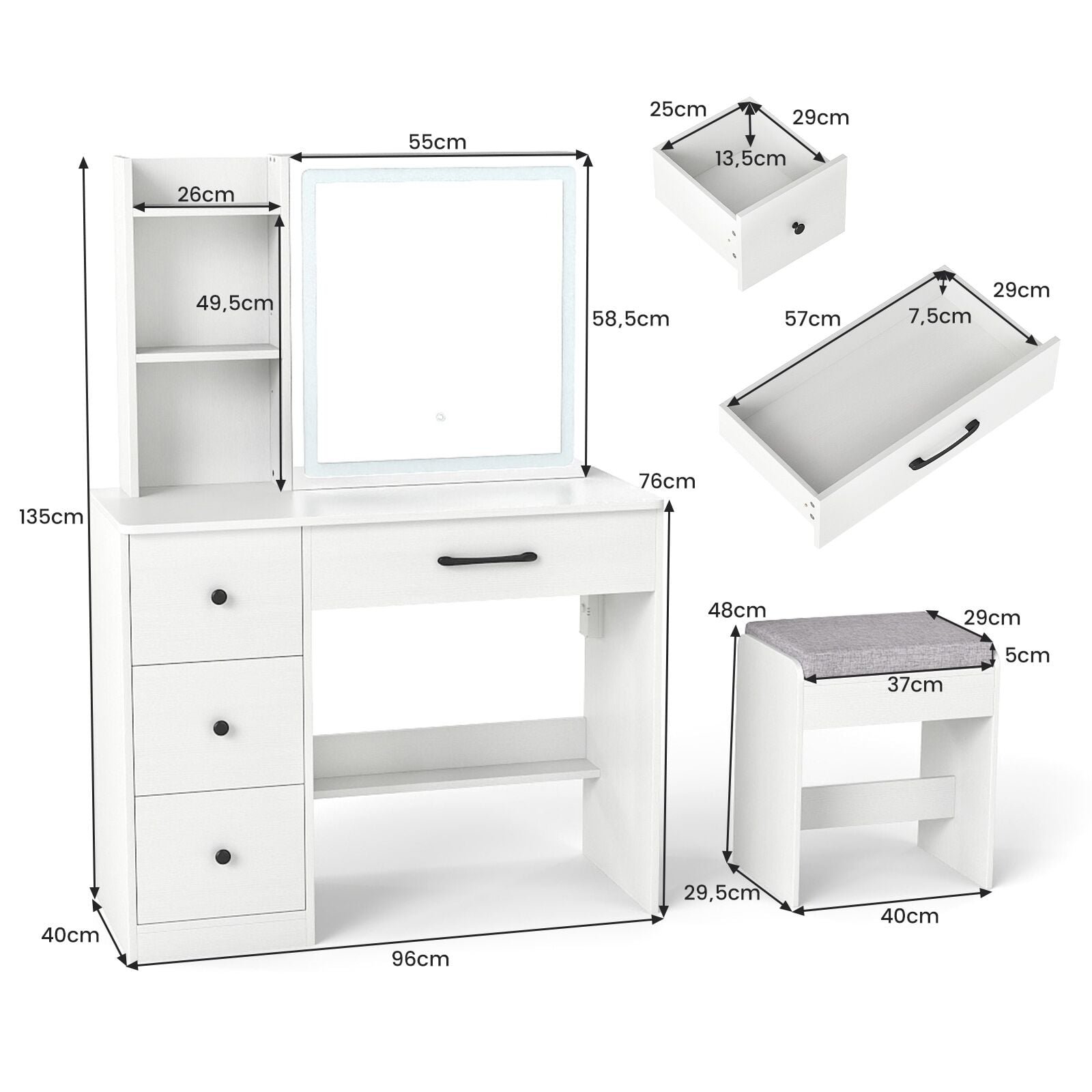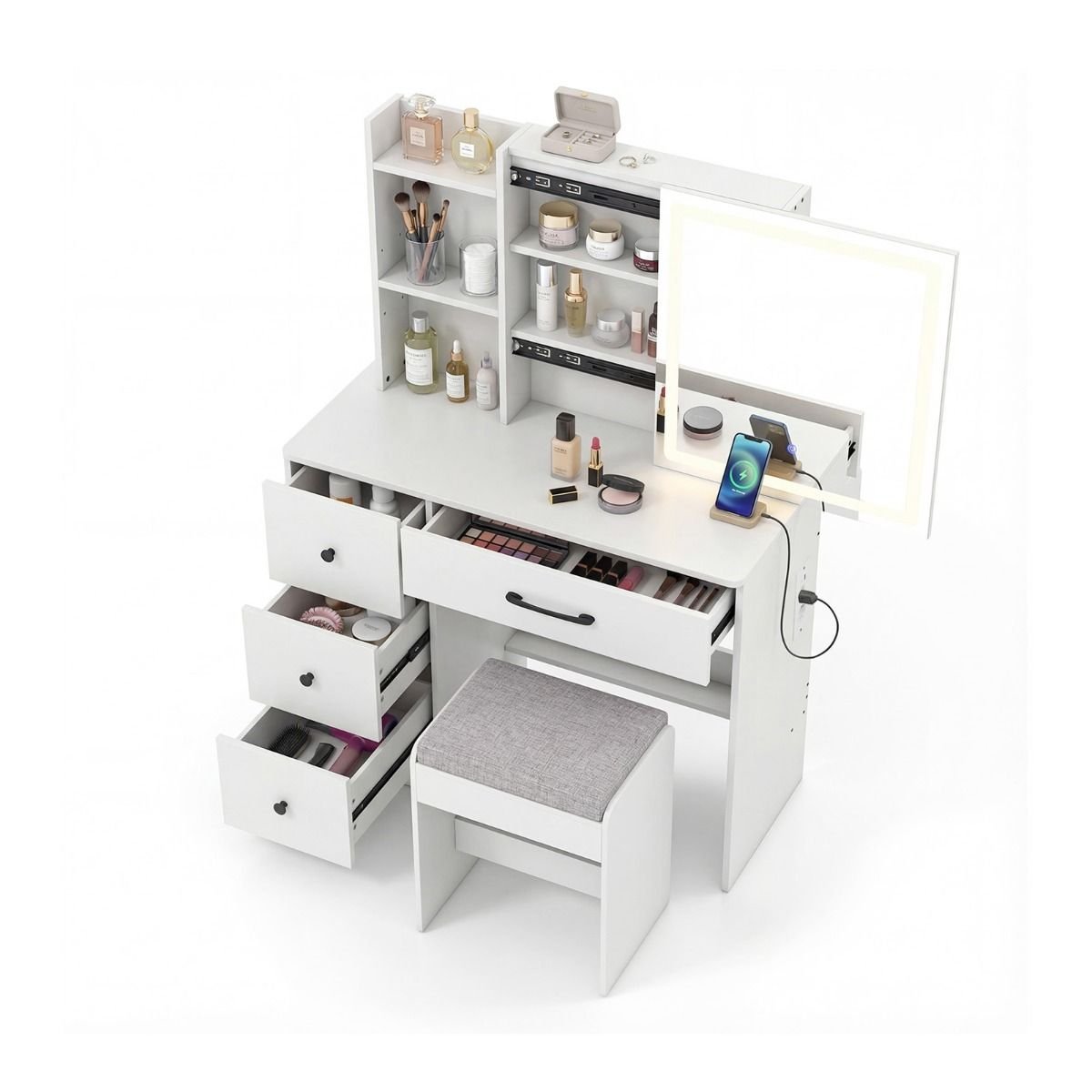 Šis universalus kosmetinio staliuko komplektas su stumdomu veidrodžiu ir LED apšvietimu yra puikus stiliaus ir funkcionalumo derinys jūsų miegamajam. Jis siūlo daugybę saugojimo vietų visoms jūsų grožio priemonėms ir turi integruotą įkrovimo stotelę, užtikrinančią šiuolaikinį patogumą. Tvirtas ir patikimas dizainas užtikrina stabilumą ir ilgaamžiškumą.
