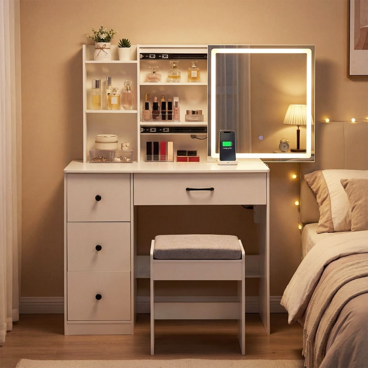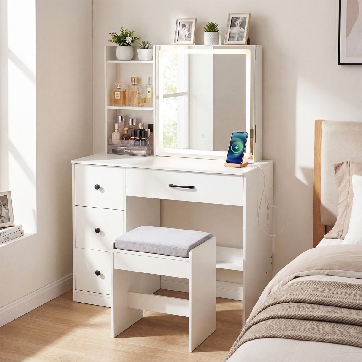 Kosmetinis staliukas su LED stumdomu veidrodžiu ir įkrovimo stotele (Balta)