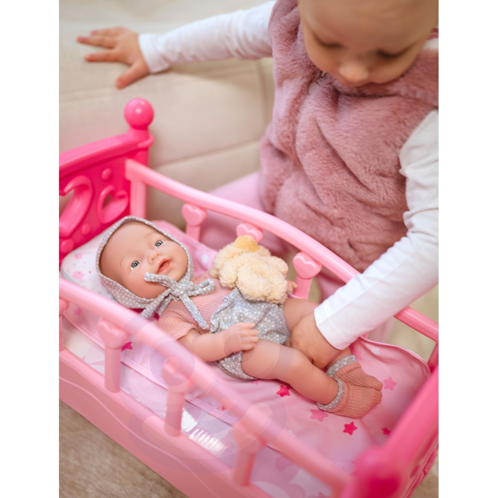 WOOPIE ROYAL lėlė kūdikis – kokybiškai ir kruopščiai pagamintas žaislas, kuris patiks jūsų vaikui. Lėlė aprengta stilingais rūbeliais, derančiomis kojinytėmis ir kepurėle. Rinkinyje taip pat rasite meškiuką, kurį lėlė gali laikyti pakaitomis su buteliuku. Lėlė turi judančias galūnes, o į jos burną galima įdėti pridedamą čiulptuką.