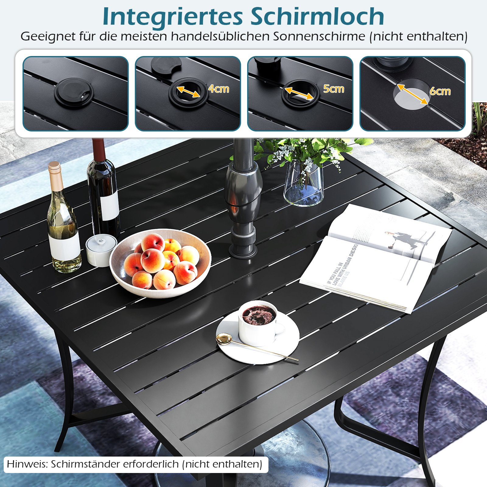 - Praktiškas skėčio angos dizainas su trimis skirtingais diametrais (4, 5 ir 6 cm) ir komplekte esančiais dangteliais.