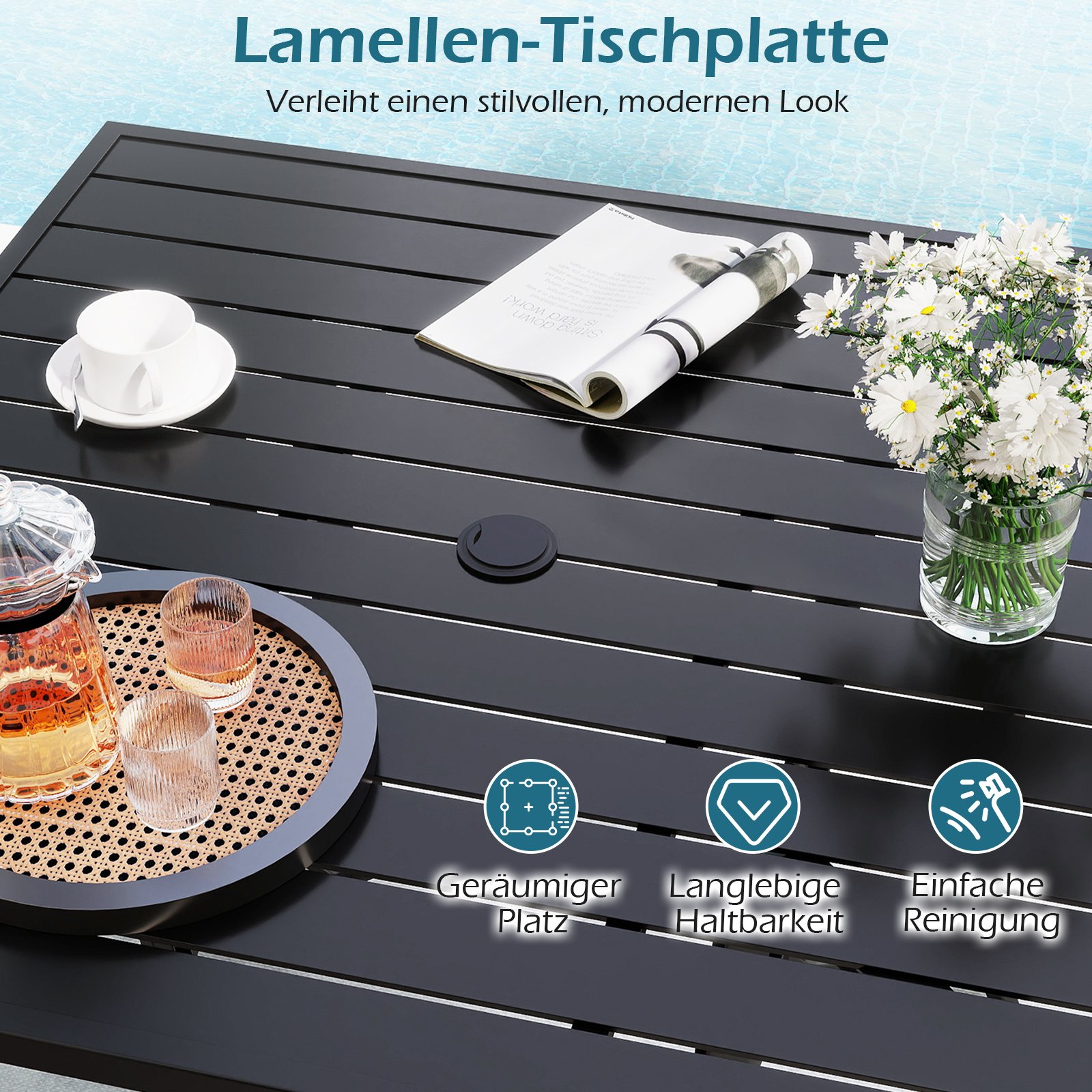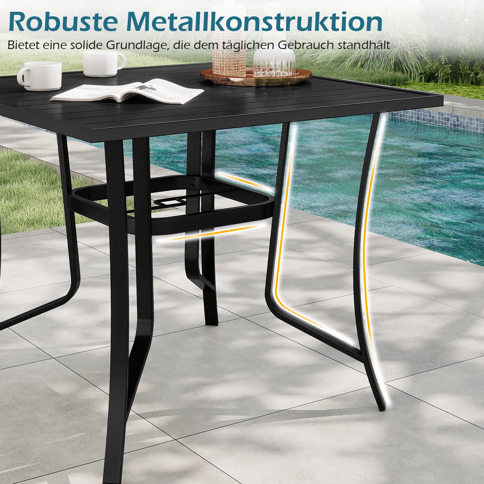 Šis tvirtos konstrukcijos terasos stalas, pagamintas iš milteliniu būdu dengto metalo, pasižymi integruota skėčio anga ir plačiu pritaikomumu. Jis yra atsparus rūdims ir nepalankioms oro sąlygoms, turi modernų lentelių rašto stalviršį ir lengvai valomą paviršių. Sustiprinta konstrukcija garantuoja išskirtinį stabilumą ir saugumą.
