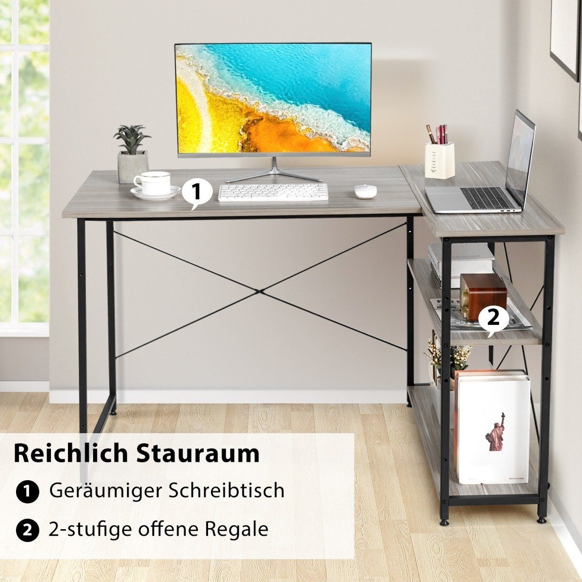 L formos kampinis rašomasis stalas su lentynomis (Pilka)