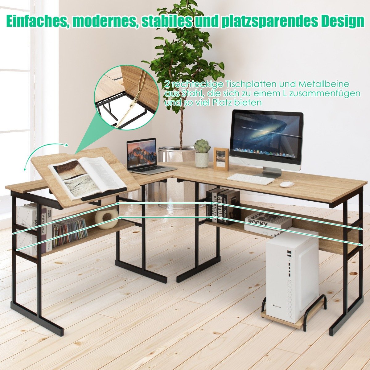 L formos kampinis rašomasis stalas su reguliuojama plokšte ir lentynomis (Natūrali)