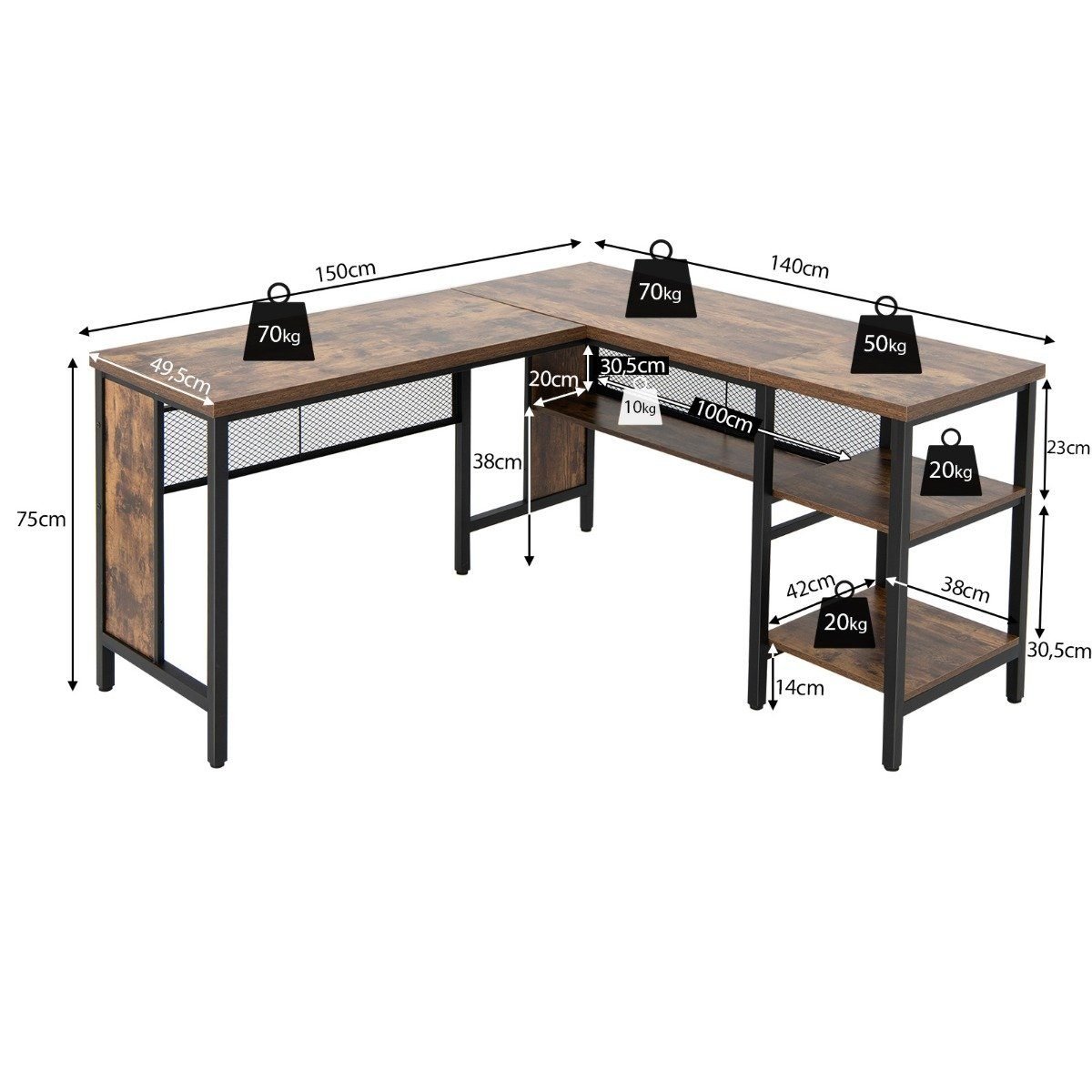 L raidės kampinis rašomasis stalas su lentynomis (Rustiška ruda)