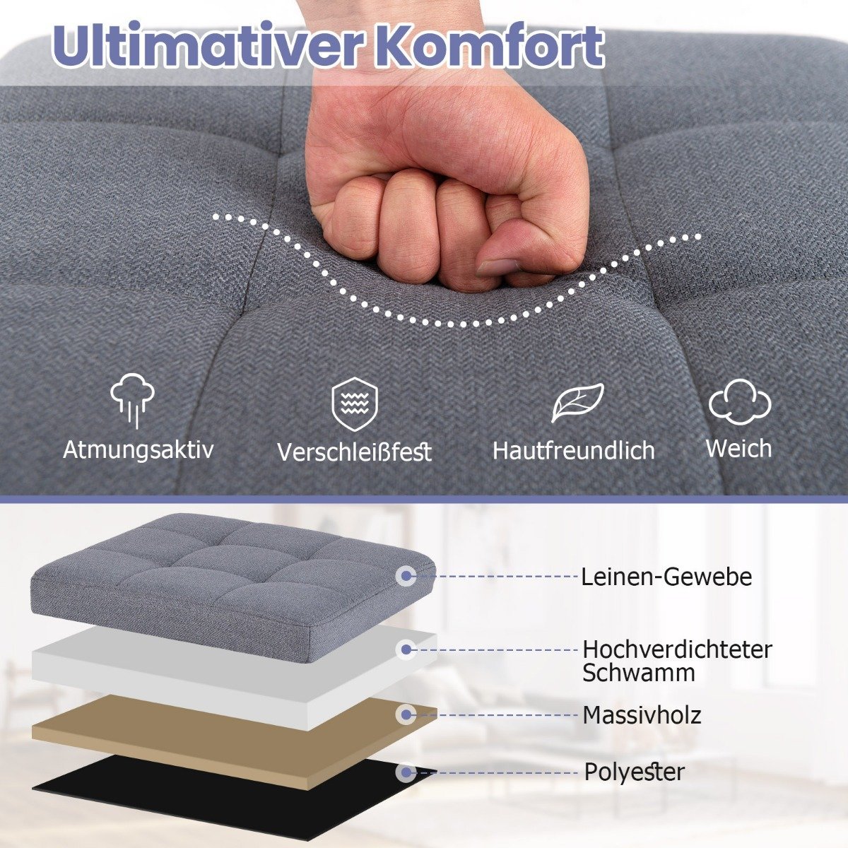 - Minkštas lininis audinys ir didelio tankio putplasčio paminkštinimas papildomam komfortui.