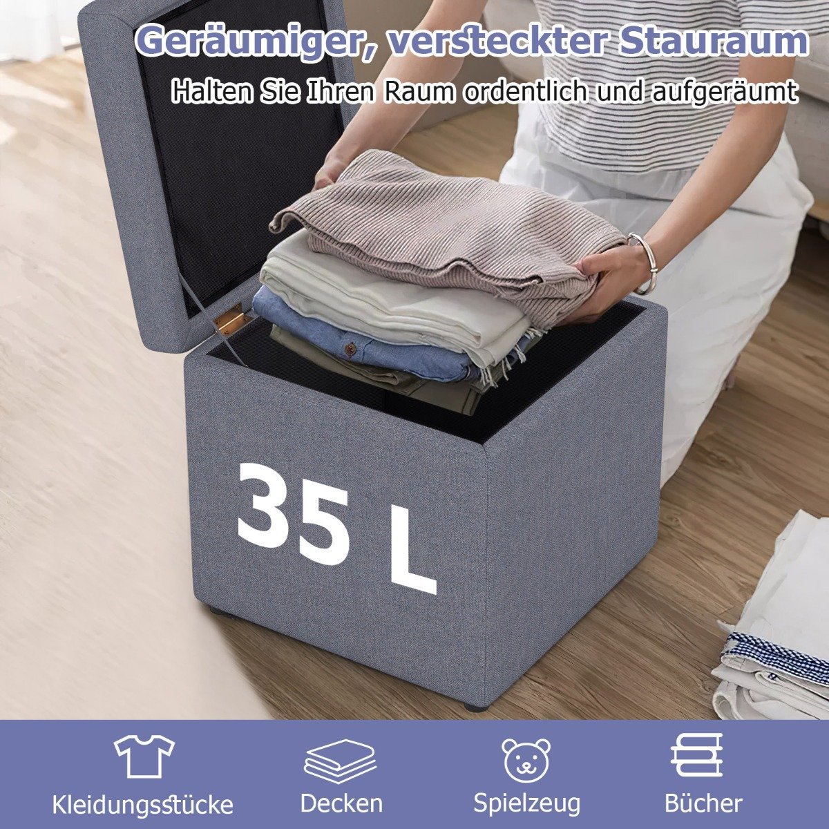 - Erdvi paslėpta daiktadėžė drabužiams, pledams, žaislams, knygoms laikyti.