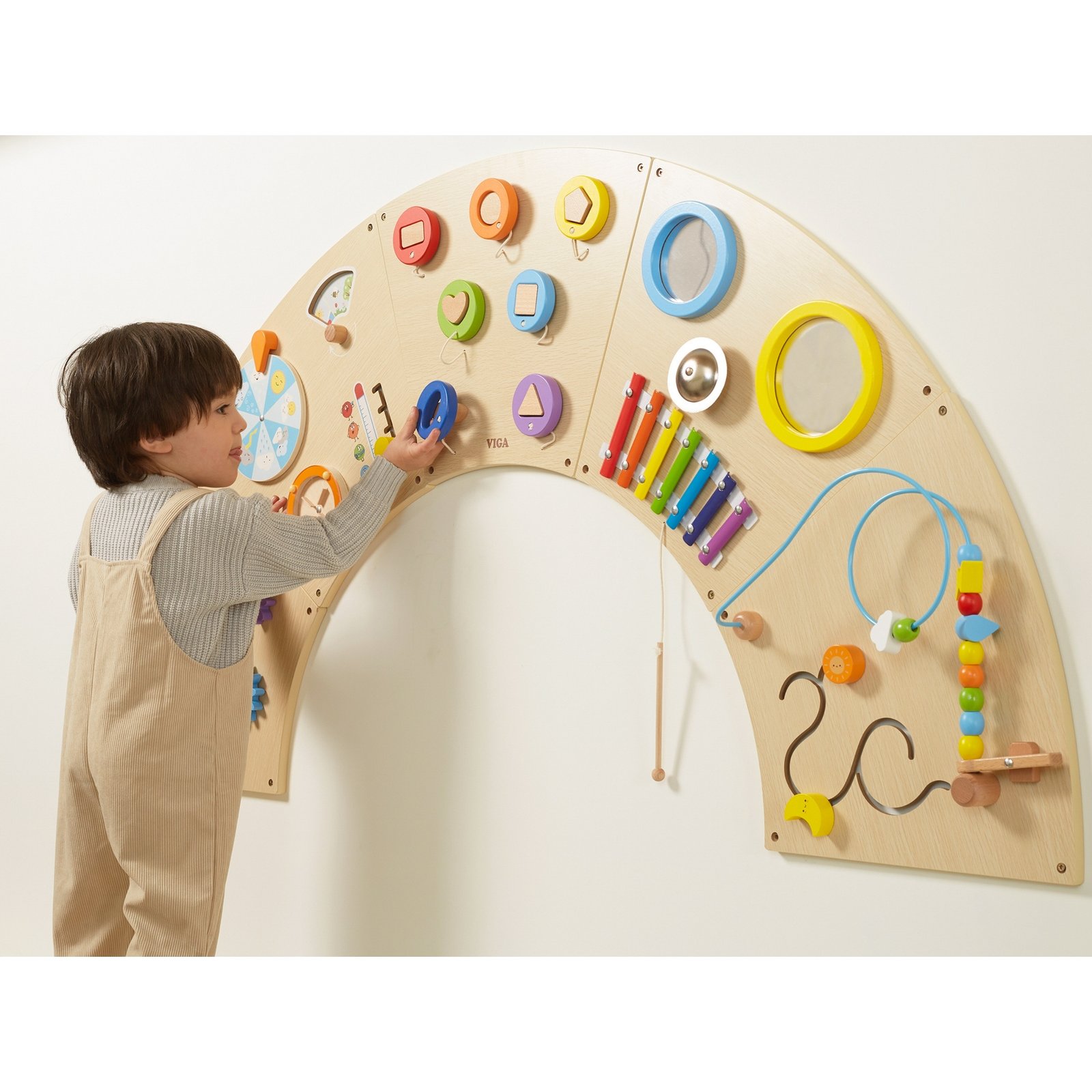 Sieninė Montessori sensorinė lenta su lankeliu – edukacinė priemonė, lavinanti vaikų smulkiąją motoriką ir žadinanti smalsumą. Joje gausu skirtingų elementų, kurie užtikrina ilgas ir įtraukiančias žaidimų valandas, skatindami jutiminį vystymąsi ir rankų-akių koordinaciją. Dėl tvirtos konstrukcijos ir kruopštaus detalizavimo, ši lenta yra tinkamas pasirinkimas namams, darželiui ar žaidimų kambariui.