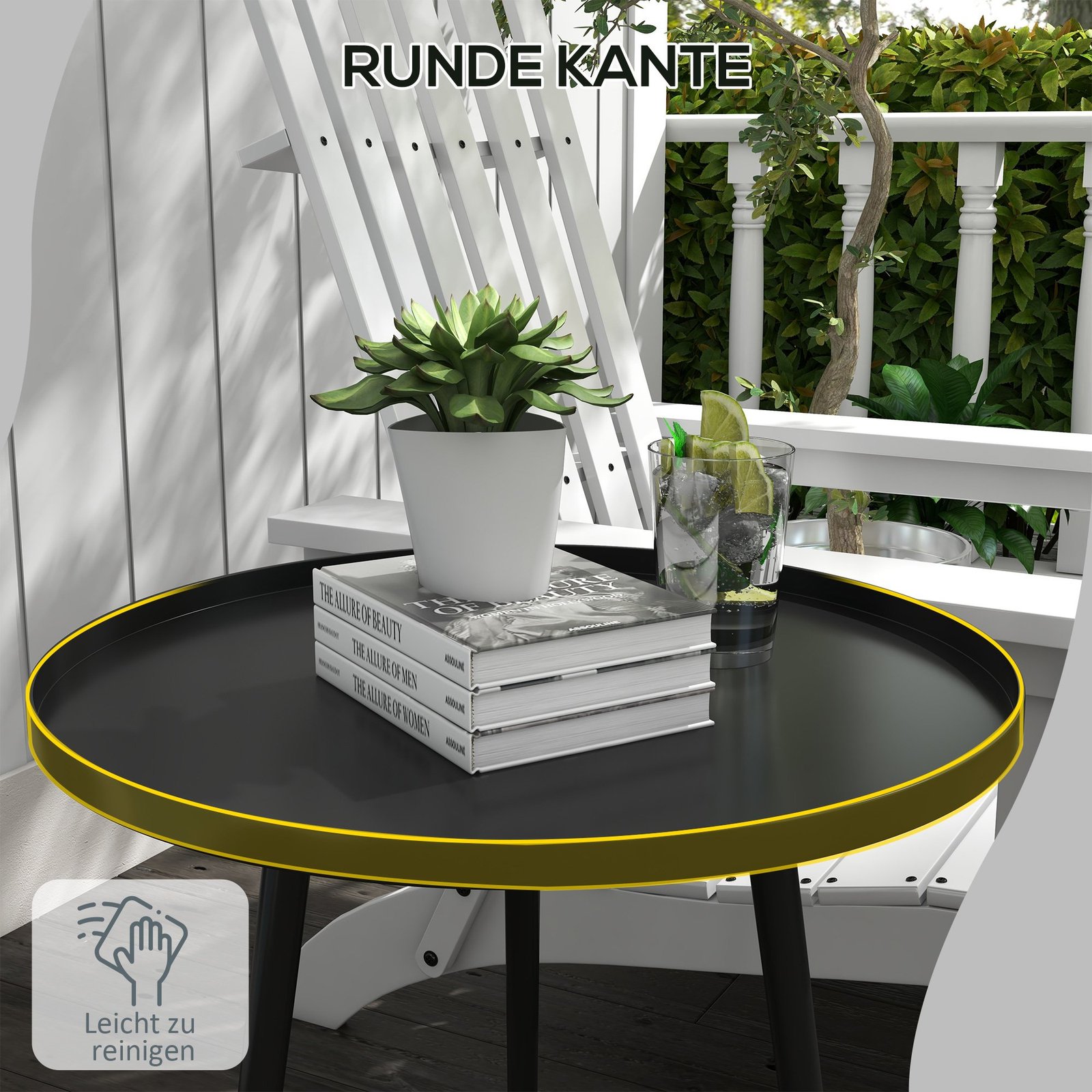 ✔ Pakeltas apvalaus sodo staliuko kraštas neleidžia daiktams nukristi