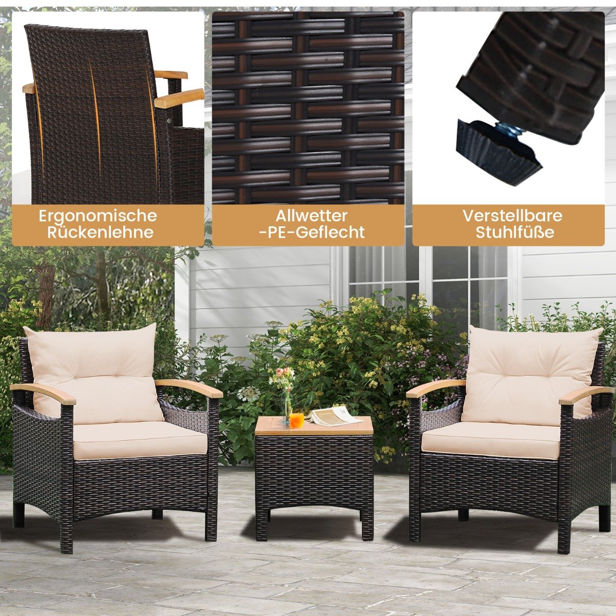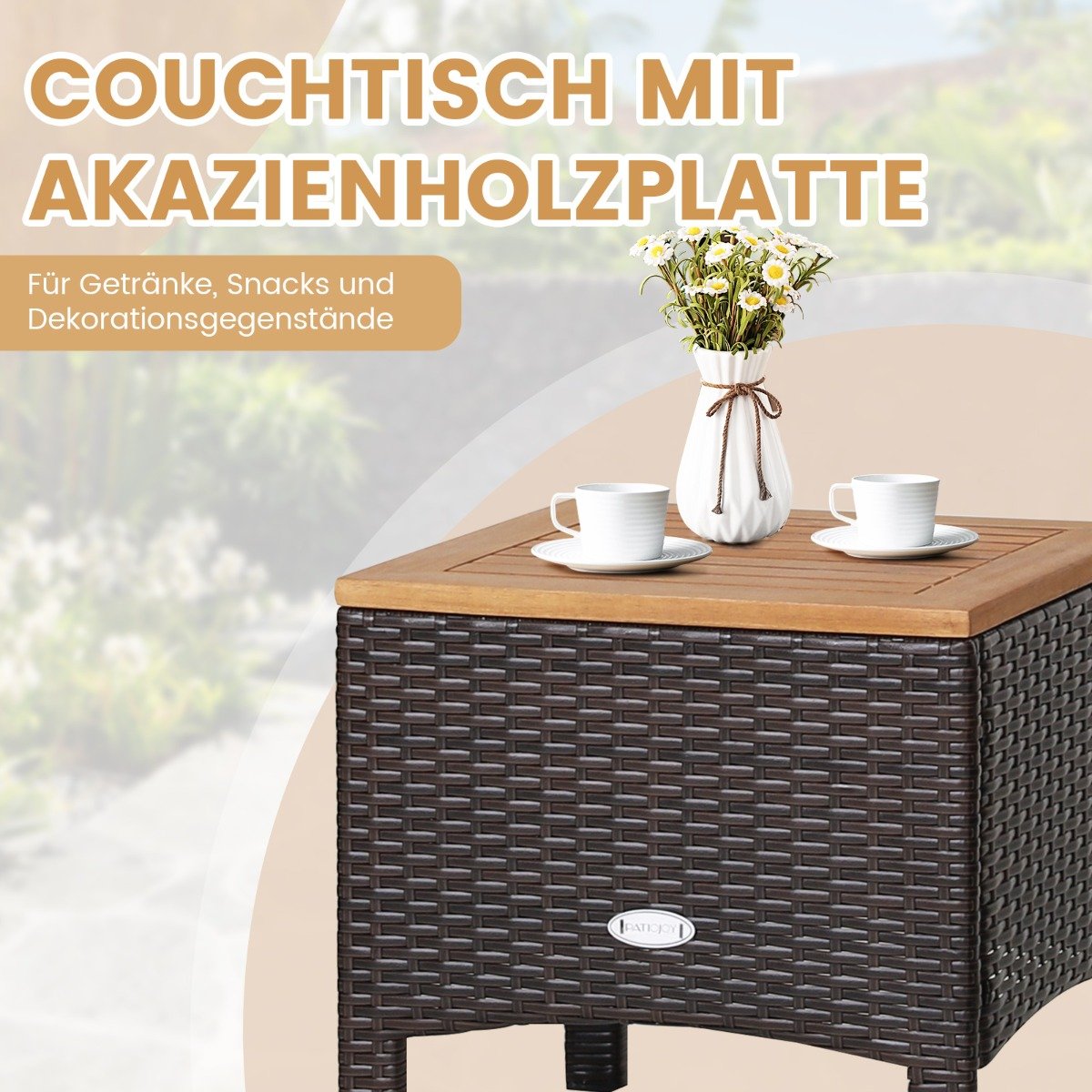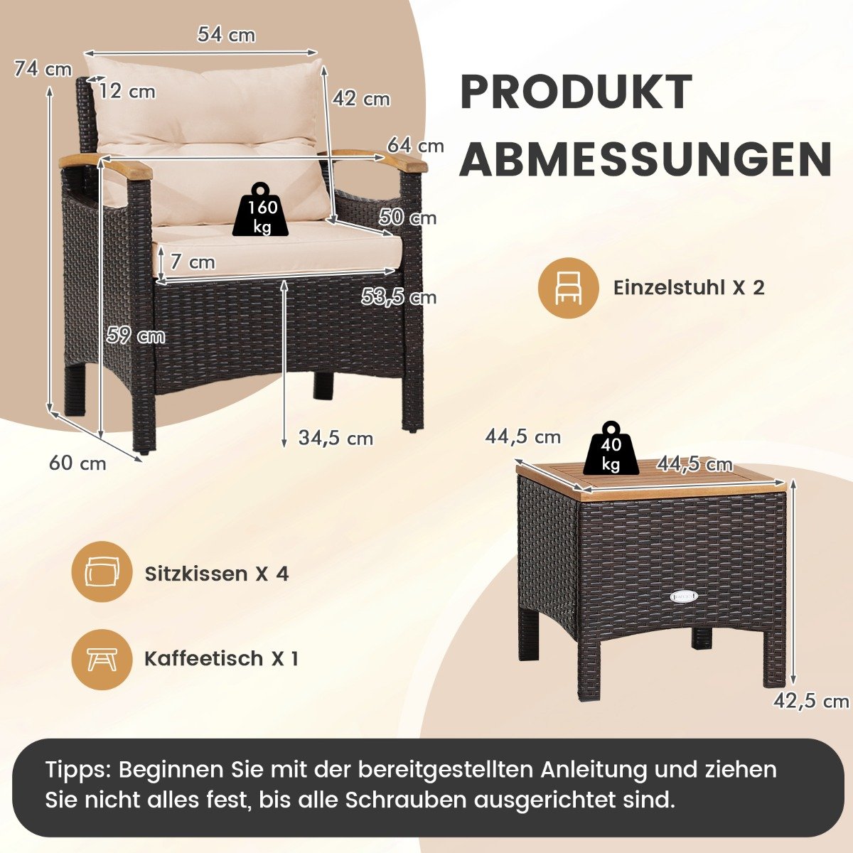 - Medžiaga: PE rotangas, metalas, akacijos mediena, kempinė, poliesterio audinys